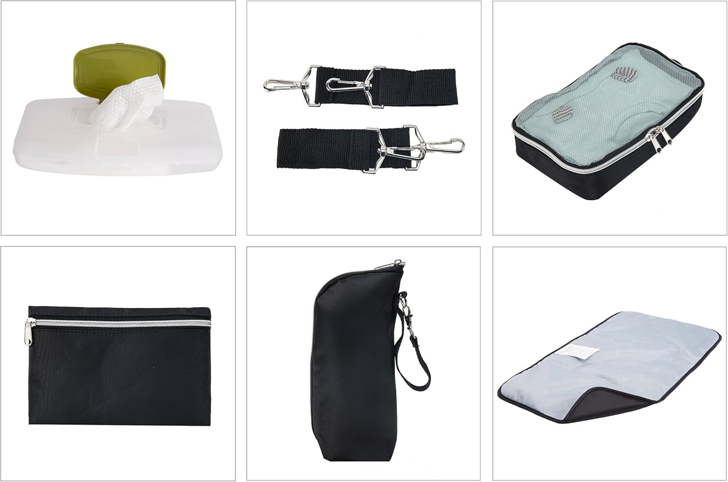 - 9-PIECE COMPLETE SET — Includes (1) large diaper bag measuring 14.8 x 14.8 x 5.4 inches, (2) mesh packing cube, (3) diaper changing pad, (4) hard case for wipes, (5) organizing insert, (6) insulated bottle bag with zipper closure, (7) stroller attachment straps, (8) personal zippered pouch, (9) adjustable shoulder straps. Please note: does not include any props not mentioned here.