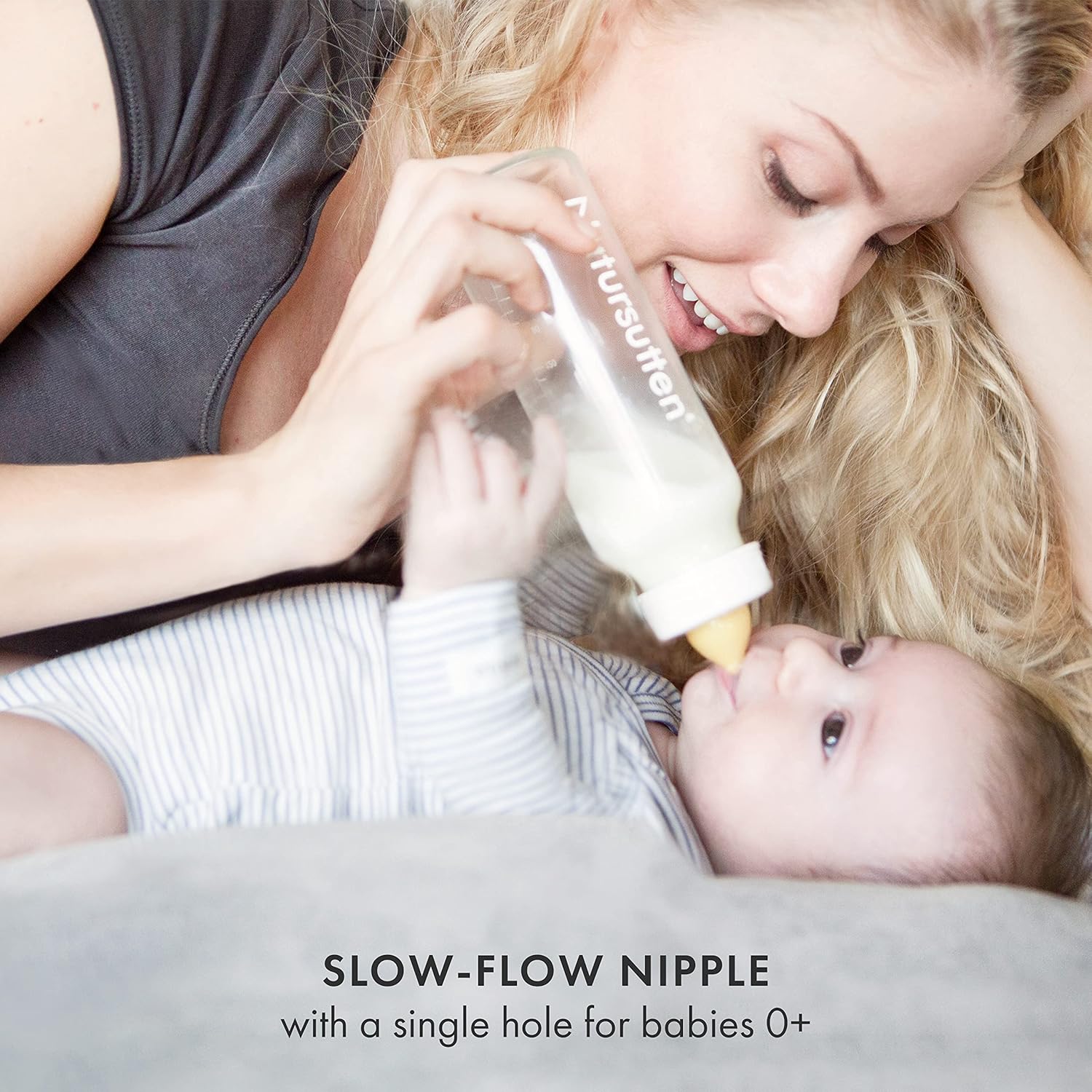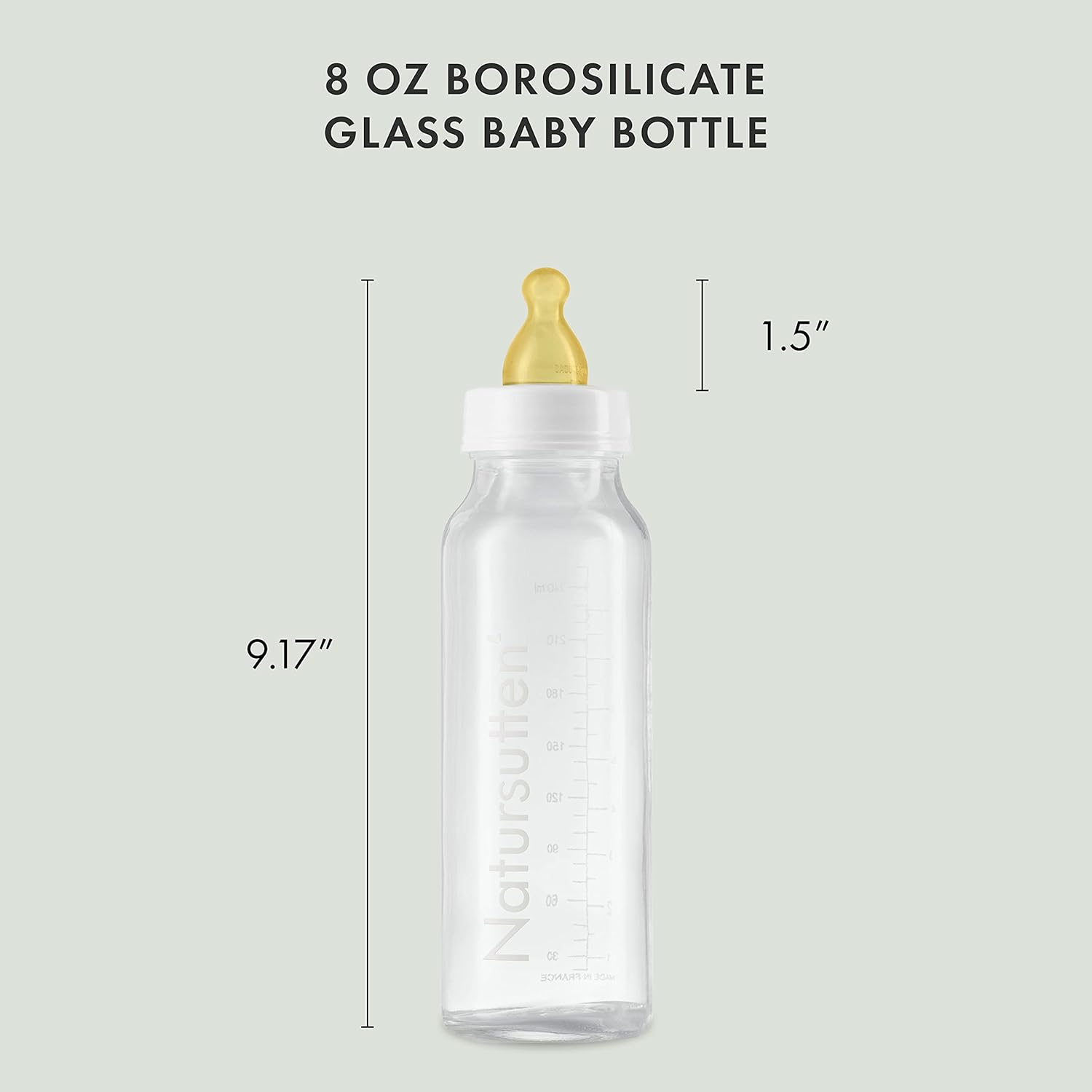 Natursutten Anti-Colic Glass Baby Bottle 2-Pack - 8 oz, 4 oz Bottles for Breastfeeding Babies - Newborn Bottles Set: Natural Rubber Slow-Flow Bottle Nipples, Seals, Valves, Baby Bottle Caps (8 Ounce)