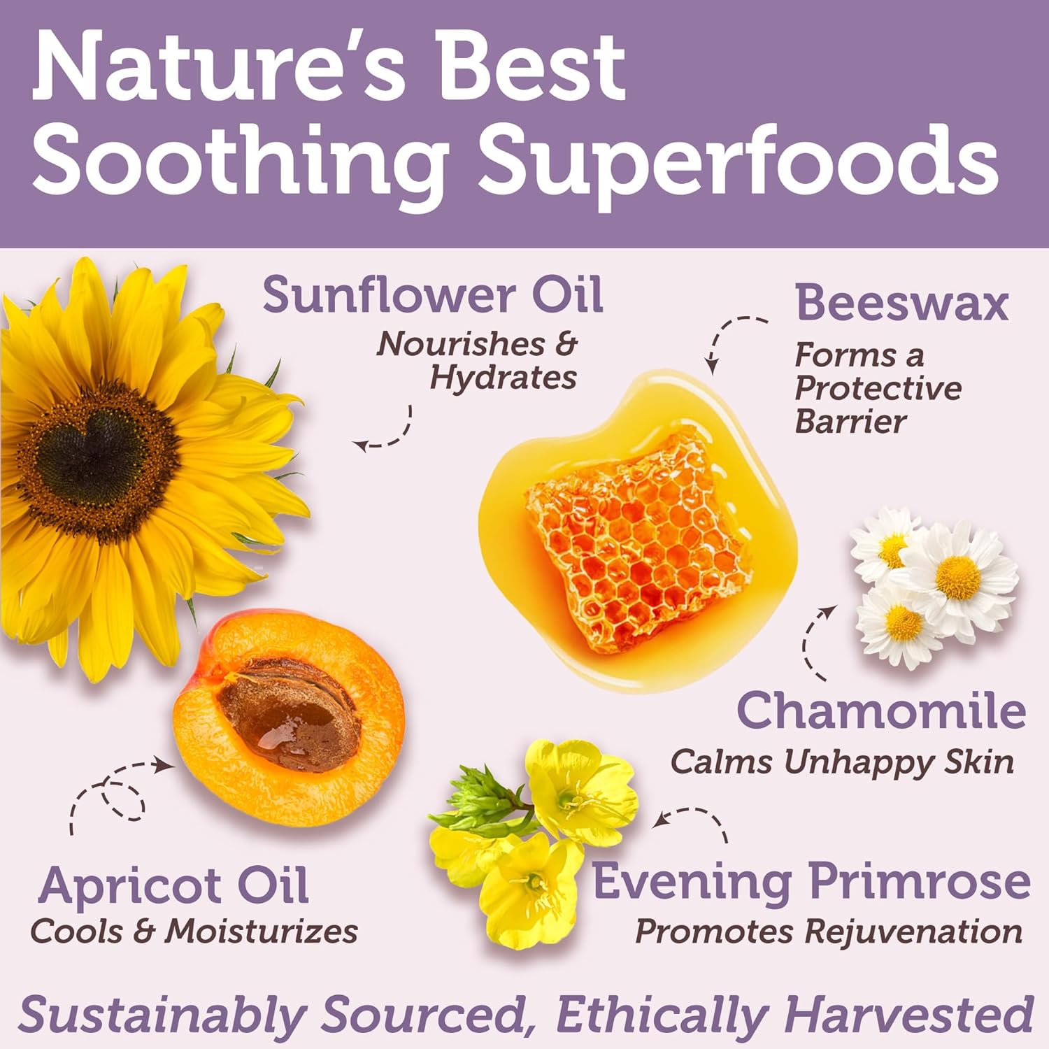 - Nature’s Superfood Blend – Chamomile, apricot oil, evening primrose, calendula, and more deliver vitamins E, A & C plus essential fatty acids to nourish delicate, sensitive skin.
