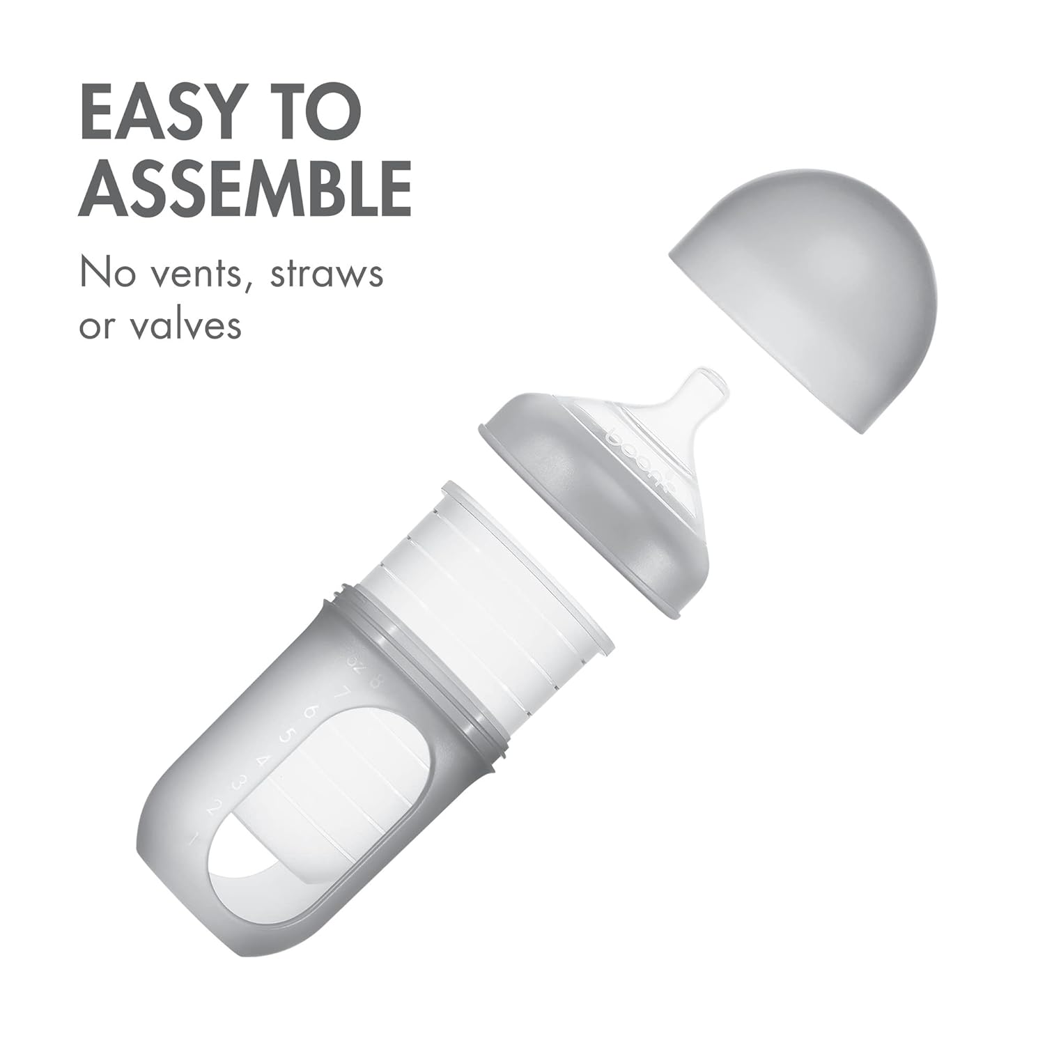 Boon Nursh Reusable Silicone Pouch Baby Bottles - Medium Flow Nipple - Silicone Baby Bottle Pouch and Nipple - Baby Feeding Essentials - Gray - 3-6 Months - 3 Count - 8 Ounce