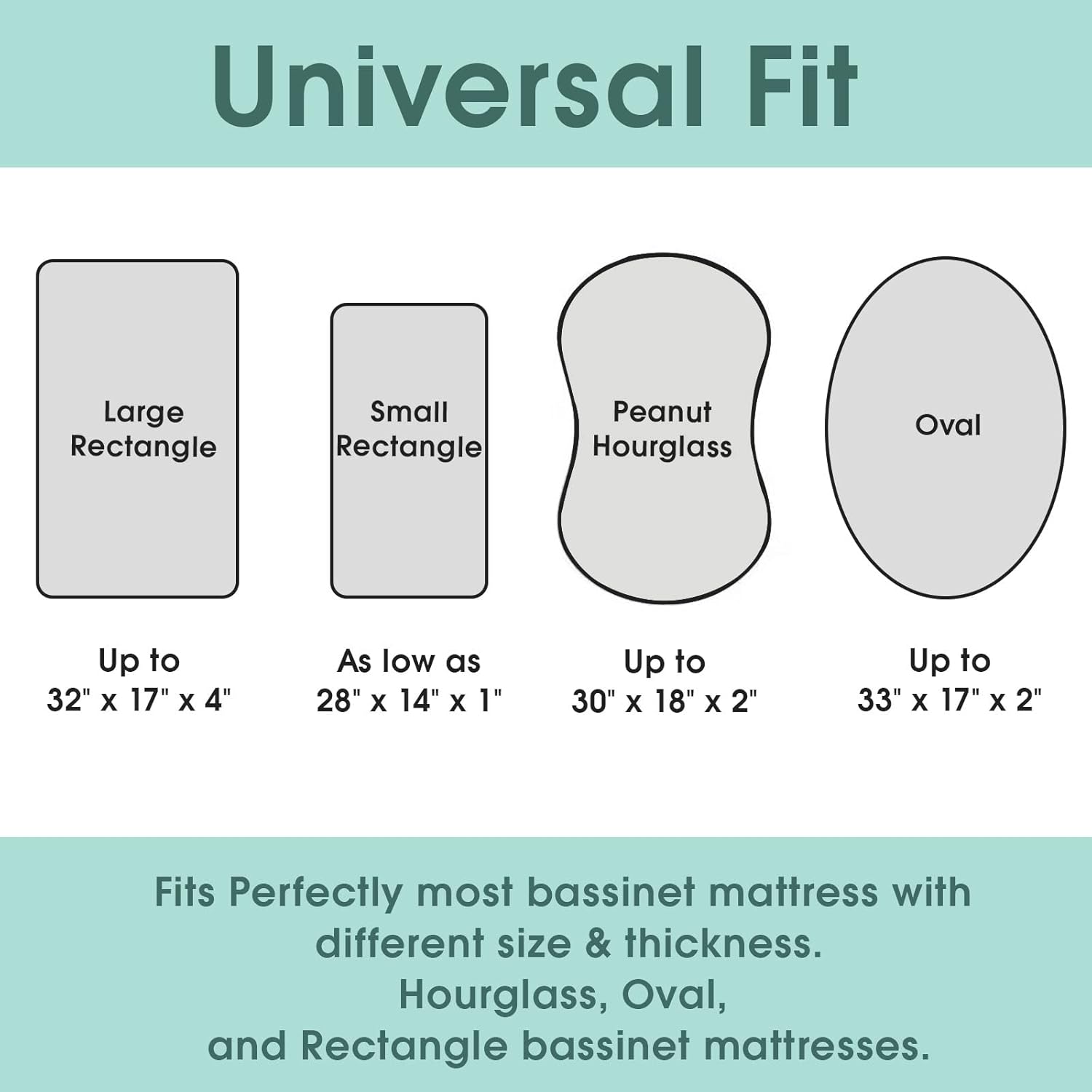 - UNIVERSAL FIT BASSINET SHEETS FOR ALL CRADLE MATTRESSES:Our bassinet sheets are designed to fit all bassinet mattress pads, including oval, round, rectangle, and hourglass shapes. Whether you’re using a bedside sleeper, Moses basket, or standard bassinet, these bassinet sheets feature stretchy elastic edges for a snug, secure fit that won’t slip or bunch.