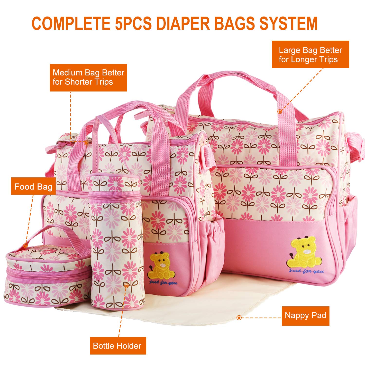 - ✅ **👜 5-IN-1 DIAPER BAG SET FOR ALL BABY ESSENTIALS**: Our diaper bag tote set includes 5 functional pieces—1 large tote bag, 1 medium tote bag, 1 insulated bottle bag, 1 snack bag, and 1 portable changing pad. The large and medium bags (each with 3 spacious compartments and 2 side pockets) hold baby clothes, diapers, wipes, and toys. The bottle holder keeps milk warm, while the snack bag stores baby food. The large bag supports up to 22 lbs—ideal for daily outings or travel.
