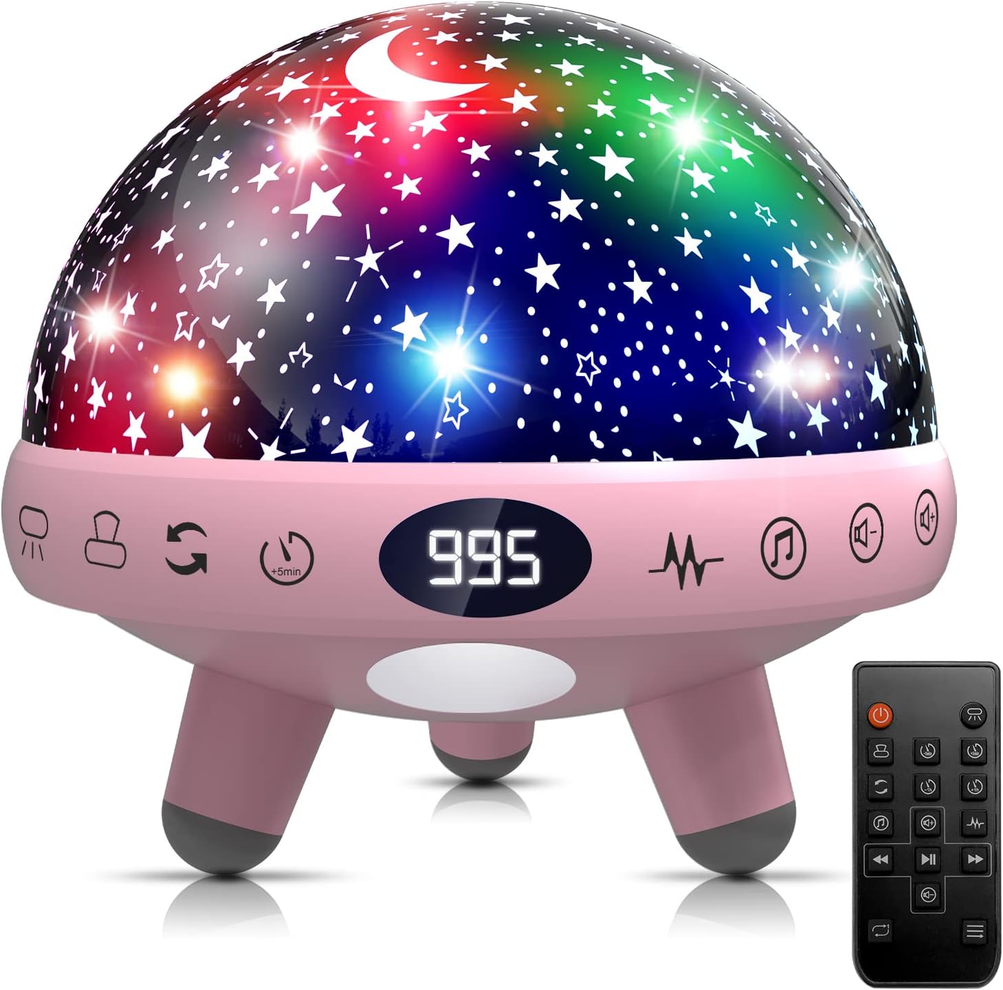 - 【EASY TO USE】You can use the remote control remotely to turn on/off the baby night light projector , customize the color, brightness, sound, volume, timer and rotation and more. You can also turn off the timer or Set 5-995 minutes timing.When the set time is up, the kids night light will automatically turn off.Parents don't have to get up after their children fall asleep to turn off the baby star projector night light, which would disturb yours and your kid's sleep.