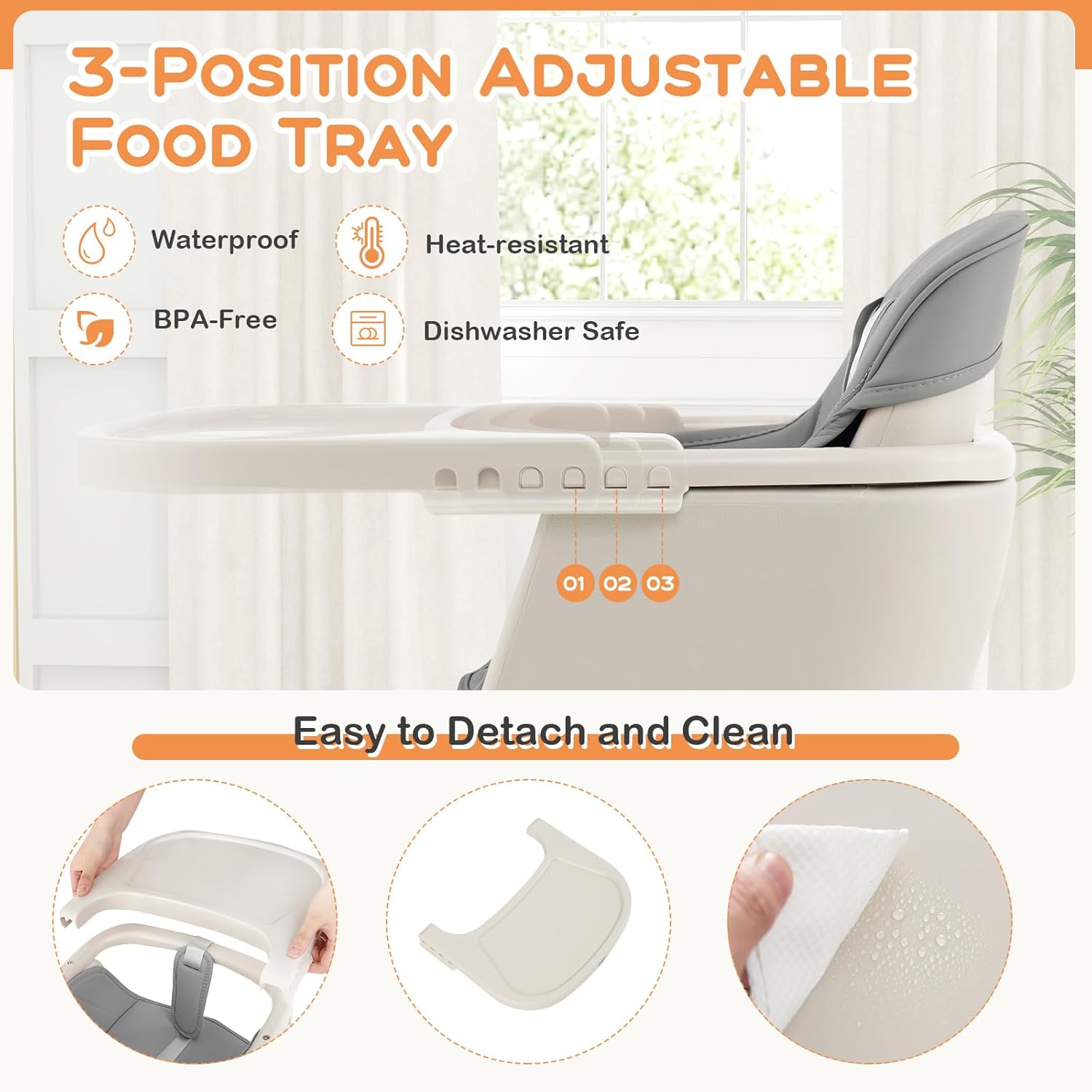 - 3-stage Adjustable & Detachable Tray: The removable tray makes cleaning a breeze. What you need to do is simply unlatch the convenient plate and move it to the sink for a thorough rinse. And three adjustable positions can provide more space for fast-growing children.