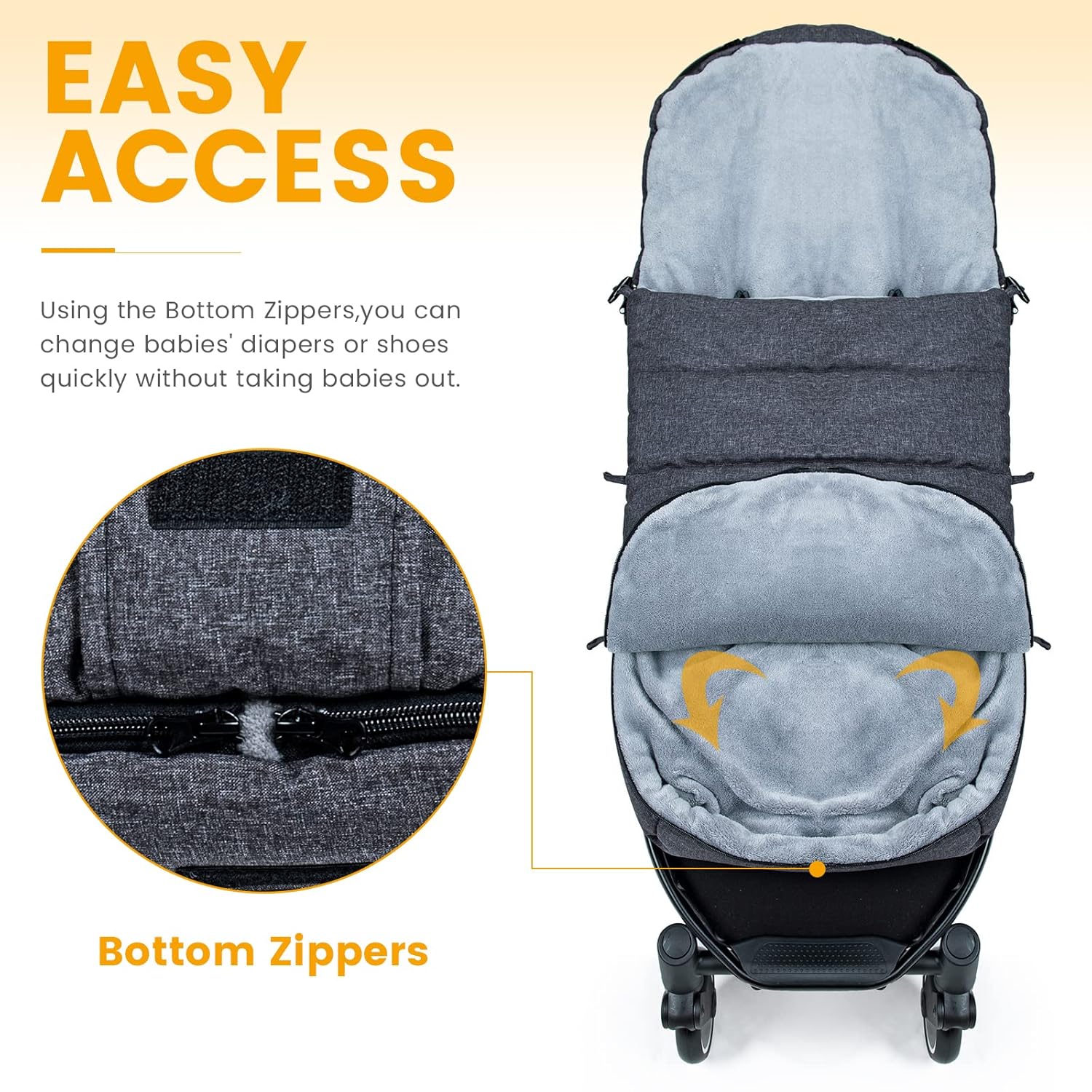 - 💡【FLEXIBLE CONTROL】: The coverage of footmuff can be changed properly by adjusting the buttons above according to the outside temperature to keep babies fairly comfortable,which can avoid feeling too hot or cold.Changing shoes,diapers and other little baby things can be done in the openable bottom without moving out babies from the footmuff, which is quite convenient and safe.