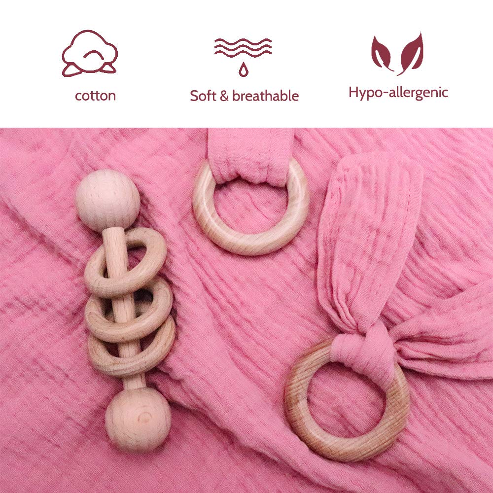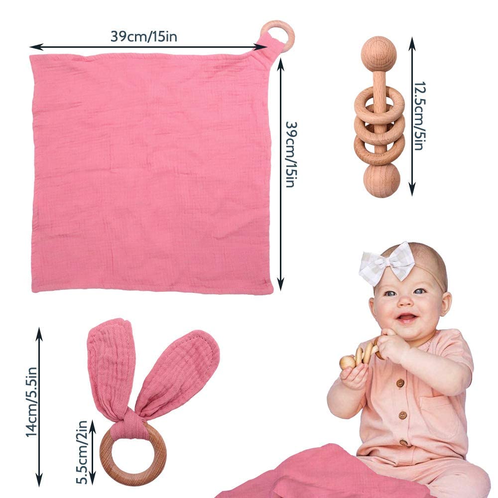 - Wooden Rattles and bunny ear rings toys made of natural wood are very suitable for baby teething. The baby lovey blanket made of 100 muslin cotton is the best companion gift for babies