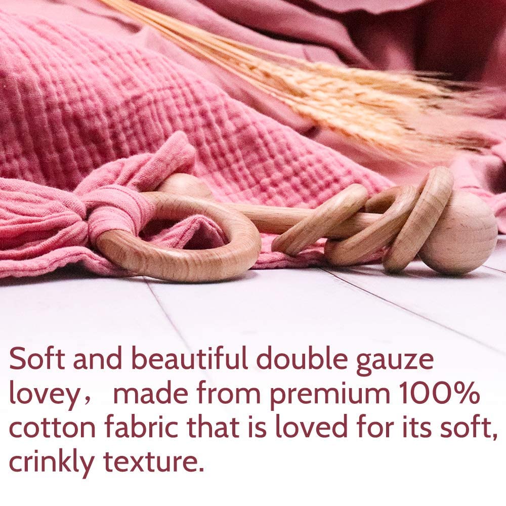 Baby Lovey, Wood Rattle, Teether Ring, 3 Pack Montessori Gift, Coral Pink, Cotton, Double Gauze, Baby Girl Shower Gift
