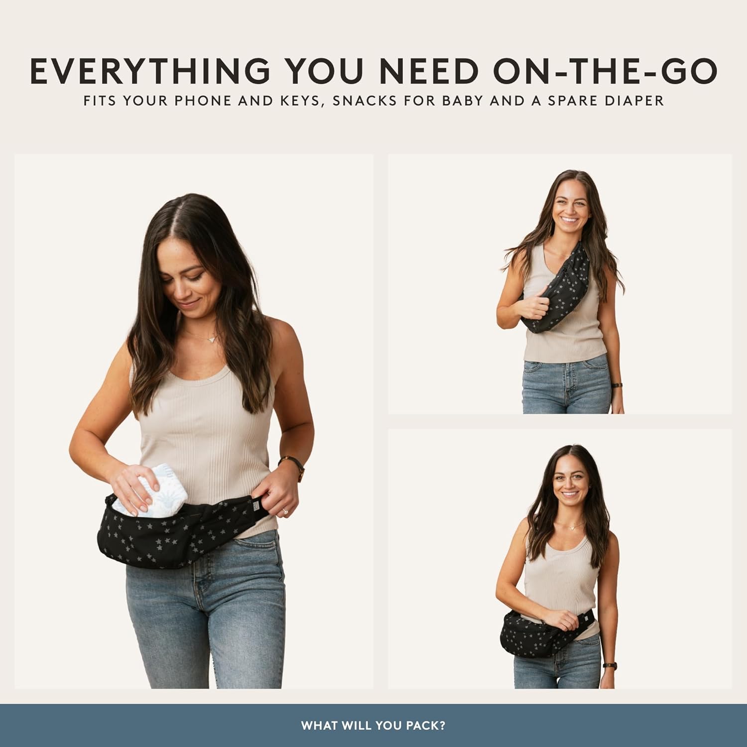 - CARRIER STORAGE AND ESSENTIAL ACCESS - Built-in storage pouch allows caregivers to keep small items like a phone, diaper, or wipes within reach. Even with the baby carriers packed into the waistband, there is space available for everyday essentials. Includes a removable UPF 50+ hood for added sun coverage.
