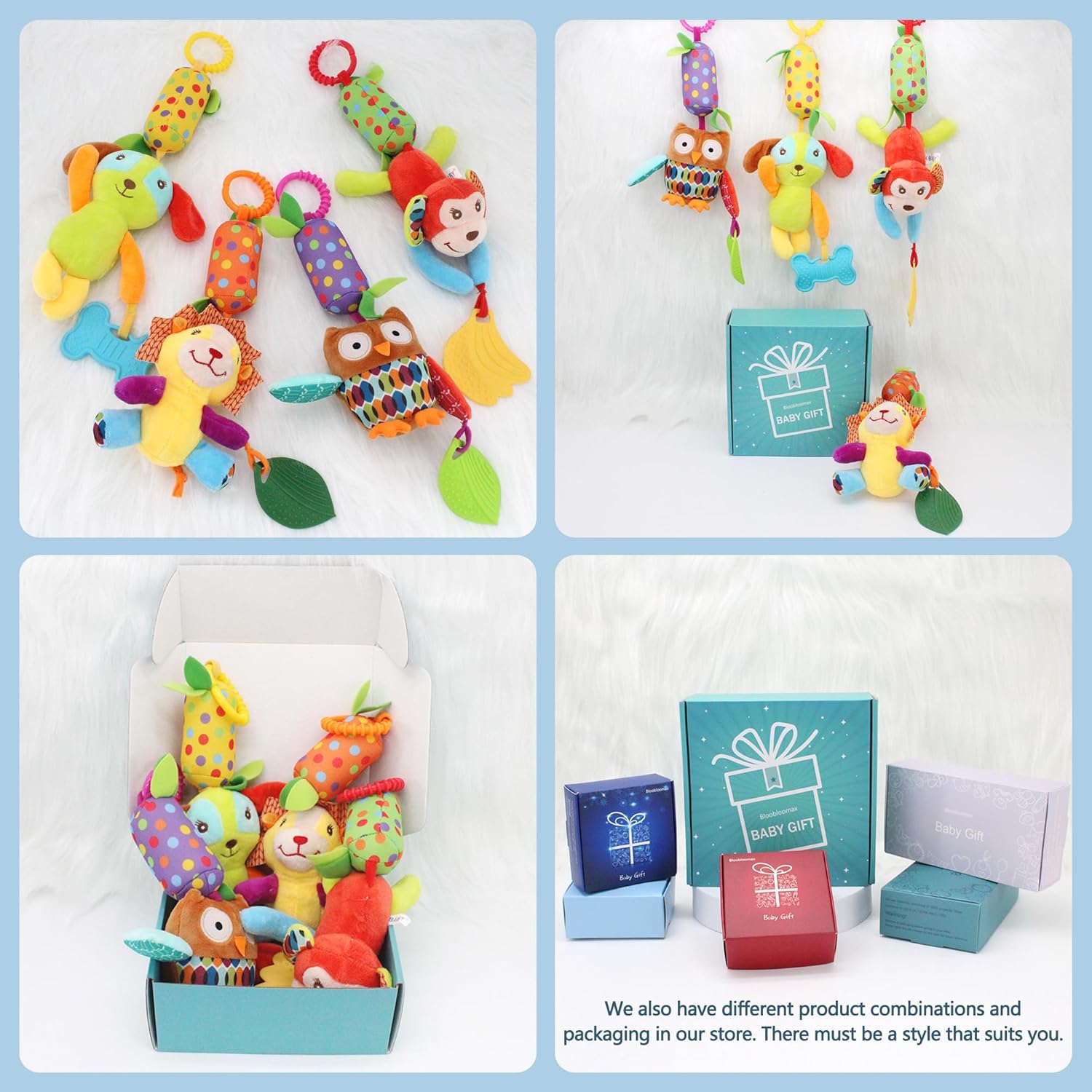 BLOOBLOOMAX Baby Soft Hanging Rattle, Car Seat Stroller Toys with Plush Animal C-Clip Ring for Infant Babies Boys and Girls 3 6 9 to 12 Months (4pcs)