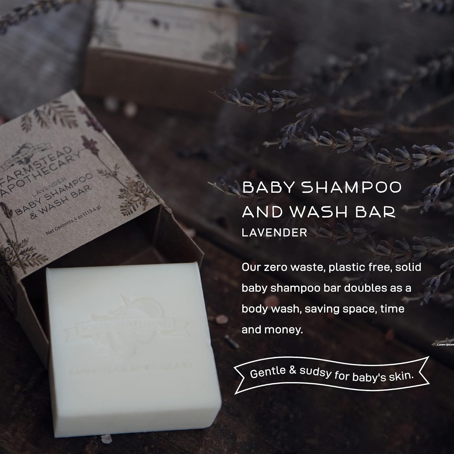 - BABY SHAMPOO & WASH BAR LAVENDER - Our Baby Shampoo Bar doubles as a Body Wash to have your babies hair and body feel clean and purified by nature's natural ingredients. Our zero waste bar is plastic free, formulated for sensitive skin, made with 100% plant based, vegan, cruelty-free, and organic & non-GMO ingredients. This bar gives more uses than leading liquid baby shampoos and is the perfect eco-friendly alternative.