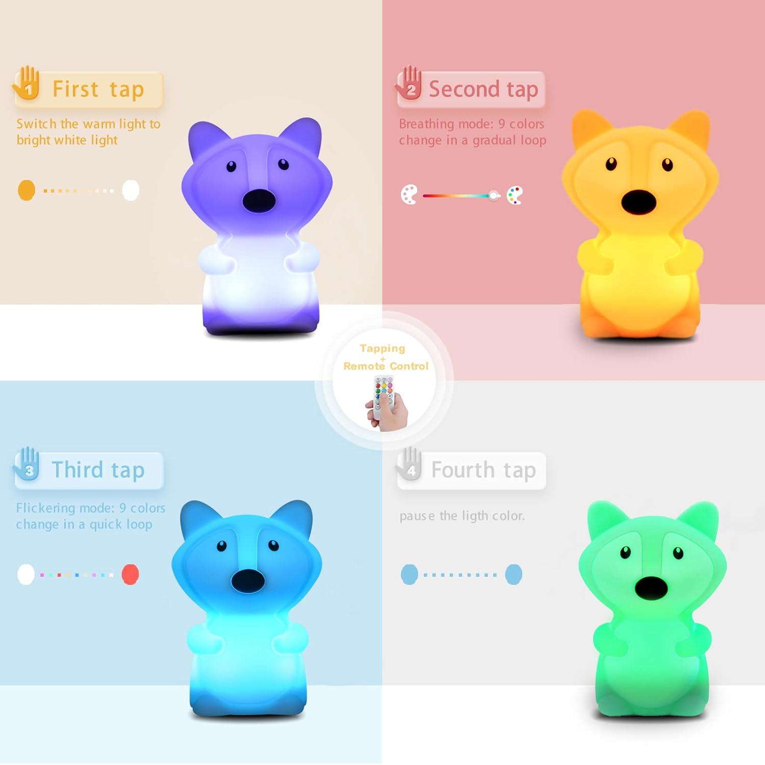 - ❤ Multifunctional Fox Night Light:Our cute night light has 9 soft light colors: red, green, blue,light blue, yellow, purple, orange,white and pink,changed by tappping. The brightness of kids night light afootry can be adjusted with the attached remote control to find the most suitable brightness for your eyes. 3 working modes from the fox lamp are available:monochrome,breathing mode-colors change in a gradual loop,and flickering mode-colors change in a quick loop,meeting your daily needs.