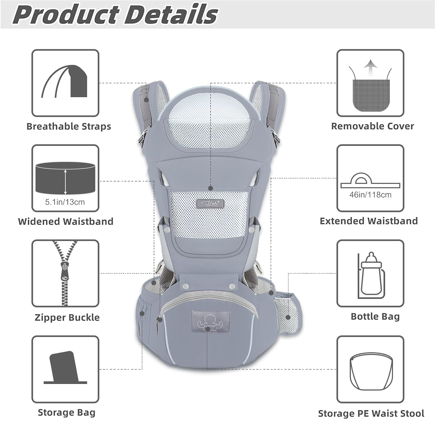 - Ergonomic Hip Seat: The waist stool maintains the baby's M-shape during carrying, helping their skeletal development. The wide waistband make the hip seat to fit snugly against the parent's waist, helping to share the weight during carrying baby. The inward sloping angle of the hip seat keeps the baby close to the parent's body comfortably and reduces bumps and shaking when parents walking. Besides, it make baby feel safety in their arms.