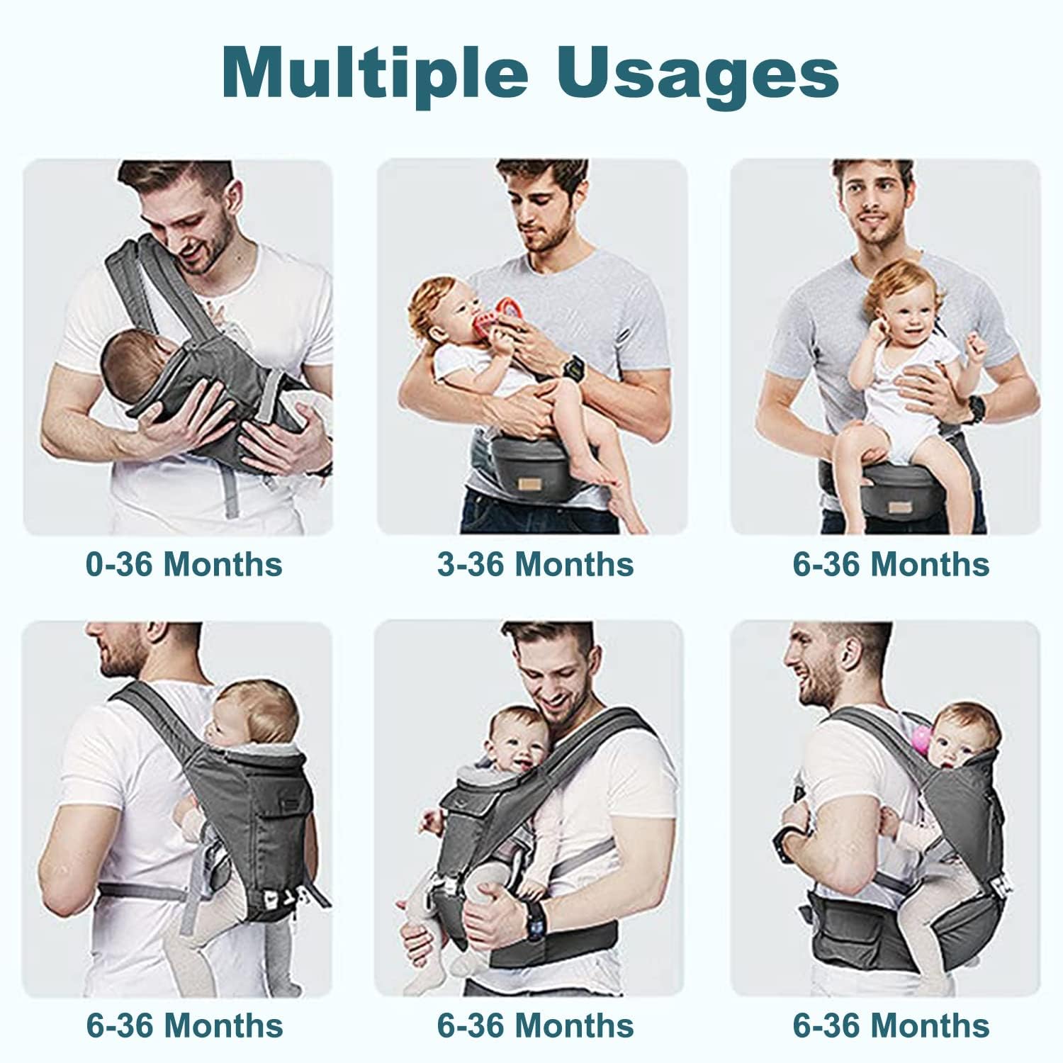 - 6-in-1 Carrying Positions - Our baby carrier for newborns to toddlers presents six unique carrying modes to adapt to your child's evolving needs: front facing in, front facing out, backpack on the back, on the hip, in a seated position, and in a standing position. These diverse options cater to different growth phases, ensuring your baby's comfort and security. Suitable for babies aged 0-36 months and weighing 7-40 lbs, this carrier promises flexibility as your child grows.