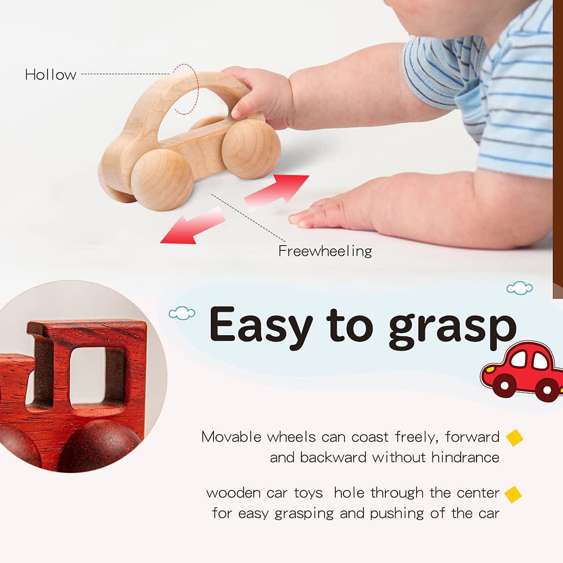 - ✎The wooden rattle toy car is not only a toy for babies to learn to play, but also a massage toy. The baby can ride his/her bike on the legs, back, arms and other parts. The four wheels ride along the sore muscles, and massaged, enjoying the feeling. It really feels great.