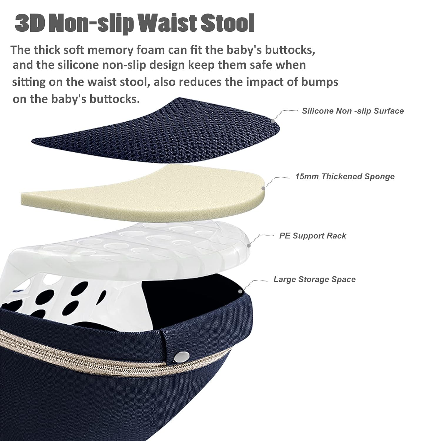 - Ergonomic Hip Seat: The waist stool maintains the baby's M-shape during carrying, helping their skeletal development. The wide waistband make the hip seat to fit snugly against the parent's waist, helping to share the weight during carrying baby. The inward sloping angle of the hip seat keeps the baby close to the parent's body comfortably and reduces bumps and shaking when parents walking. Besides, it make baby feel safety in their arms.