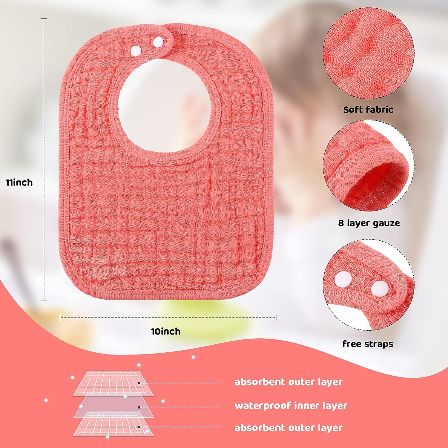 - Rich amounts: the package contains 8 pieces baby burp cloths and bibs in different colors, 4 pieces muslin burp cloths and 4 pieces muslin bandana drool bibs with adjustable snap, enough quantity and different colors to meet your baby's daily usages or replacements