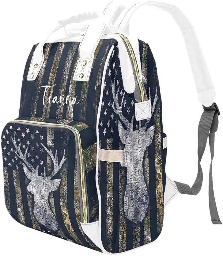 American Flag Camo Deer Diaper Bags with Name Waterproof Mummy Backpack Nappy Nursing Baby Bags Gifts Tote Bag for Women One Size