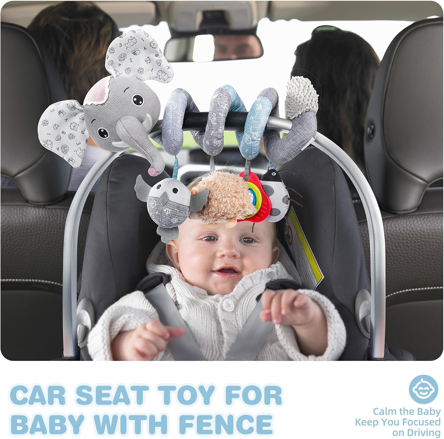 Jollybaby Crib Stroller Car Seat Toys for Baby 0-3-6-9-12 Months, Tummy Time Hanging Sensory Toys for Newborn with Music Box and Teether, Spiral Carseat Toy for Boys Girls Gifts (09-Sz Gray Elephant)