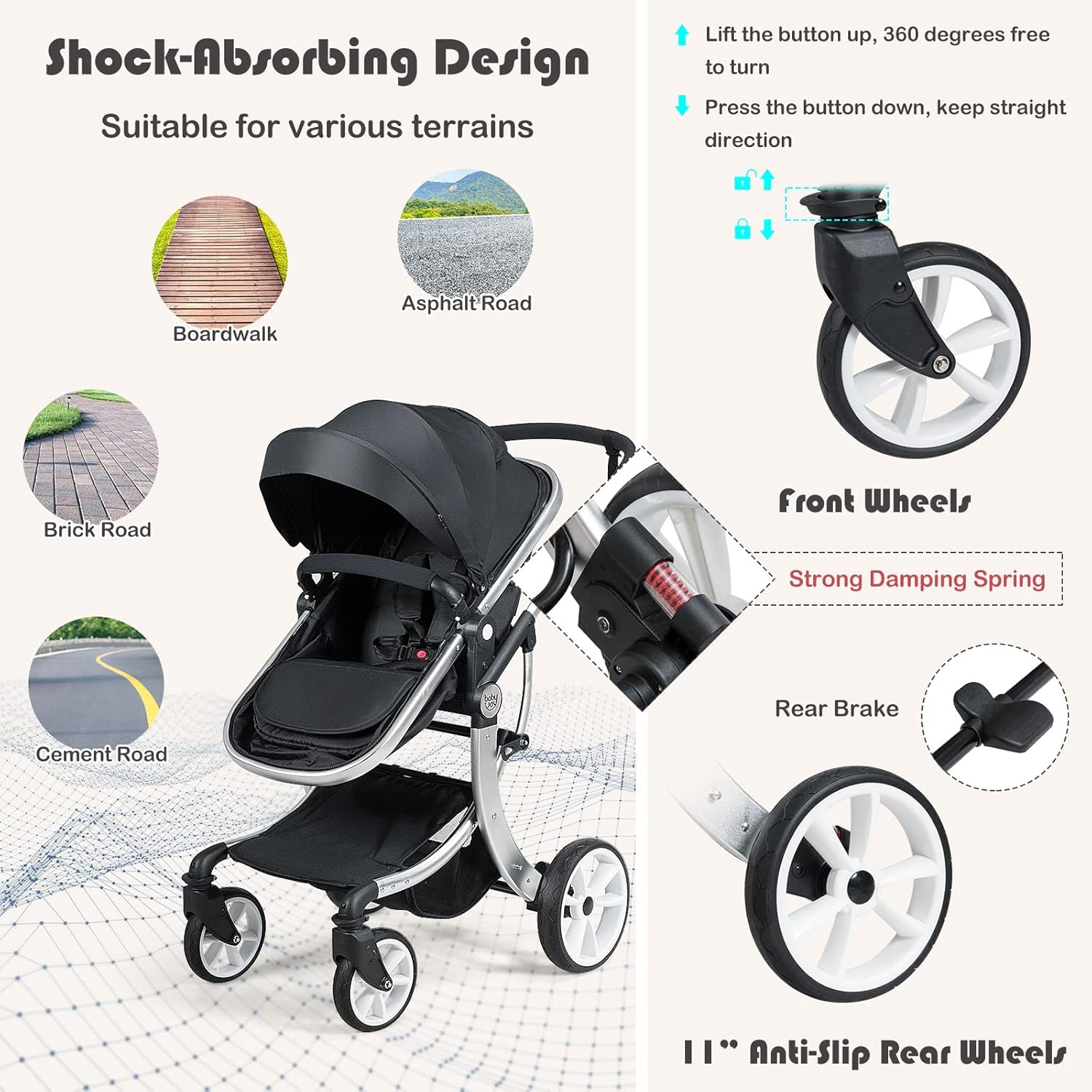 - All-Terrain Wheels: Four wheels adopt advanced shock absorbing design with strong damping springs, making the stroller available for multiple kinds of roads. The front wheel with lock can either go straight or 360° rotate at your needs. And the rear wheels are designed with a brake for emergent stop.