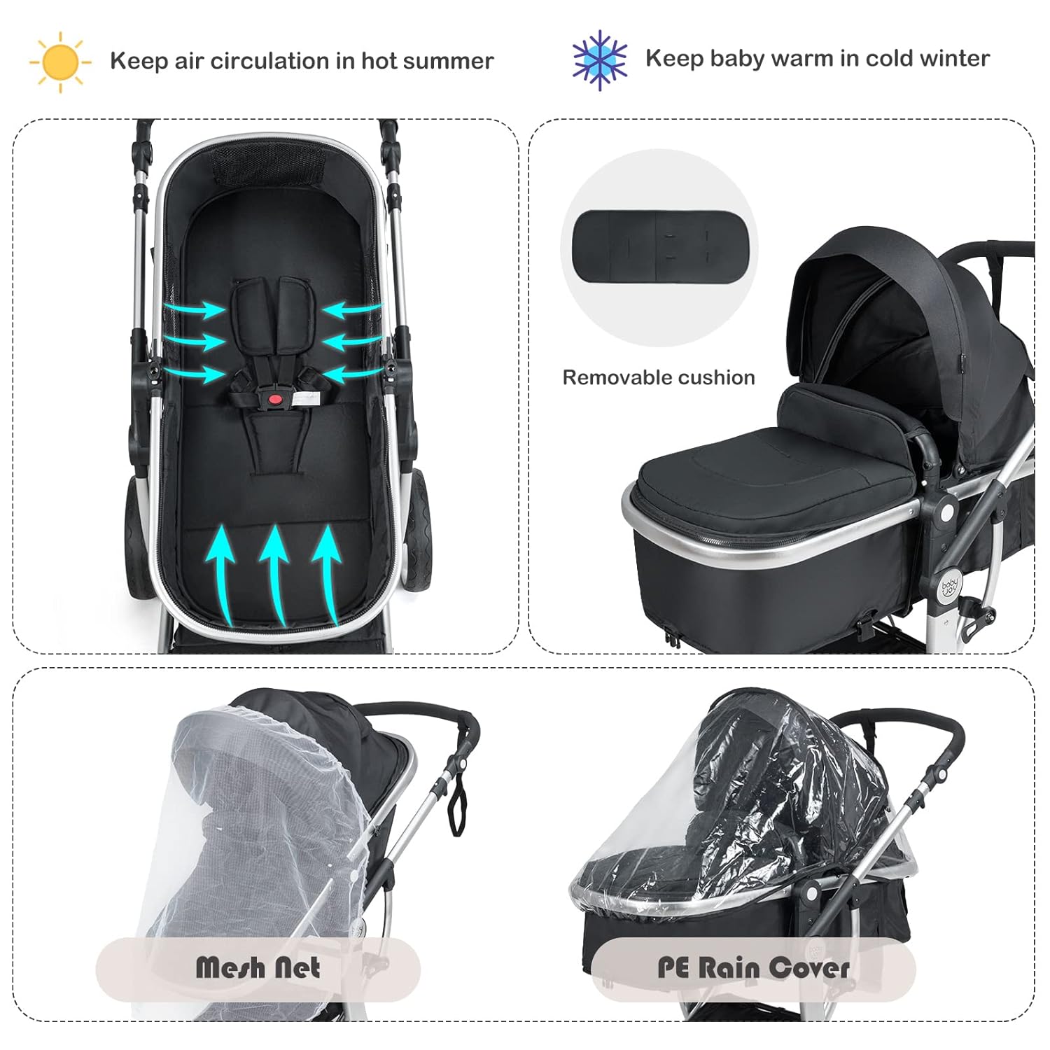 - Comfortable & Safe Seat: Equipped with removable foot cover and cushion, the stroller will keep baby warm throughout the winter. Furthermore, the seat also features 5-point safety harness and detachable guardrail, highly ensuring your baby’s security. And the anti-release wrist rope well avoids stroller’s slipping away.