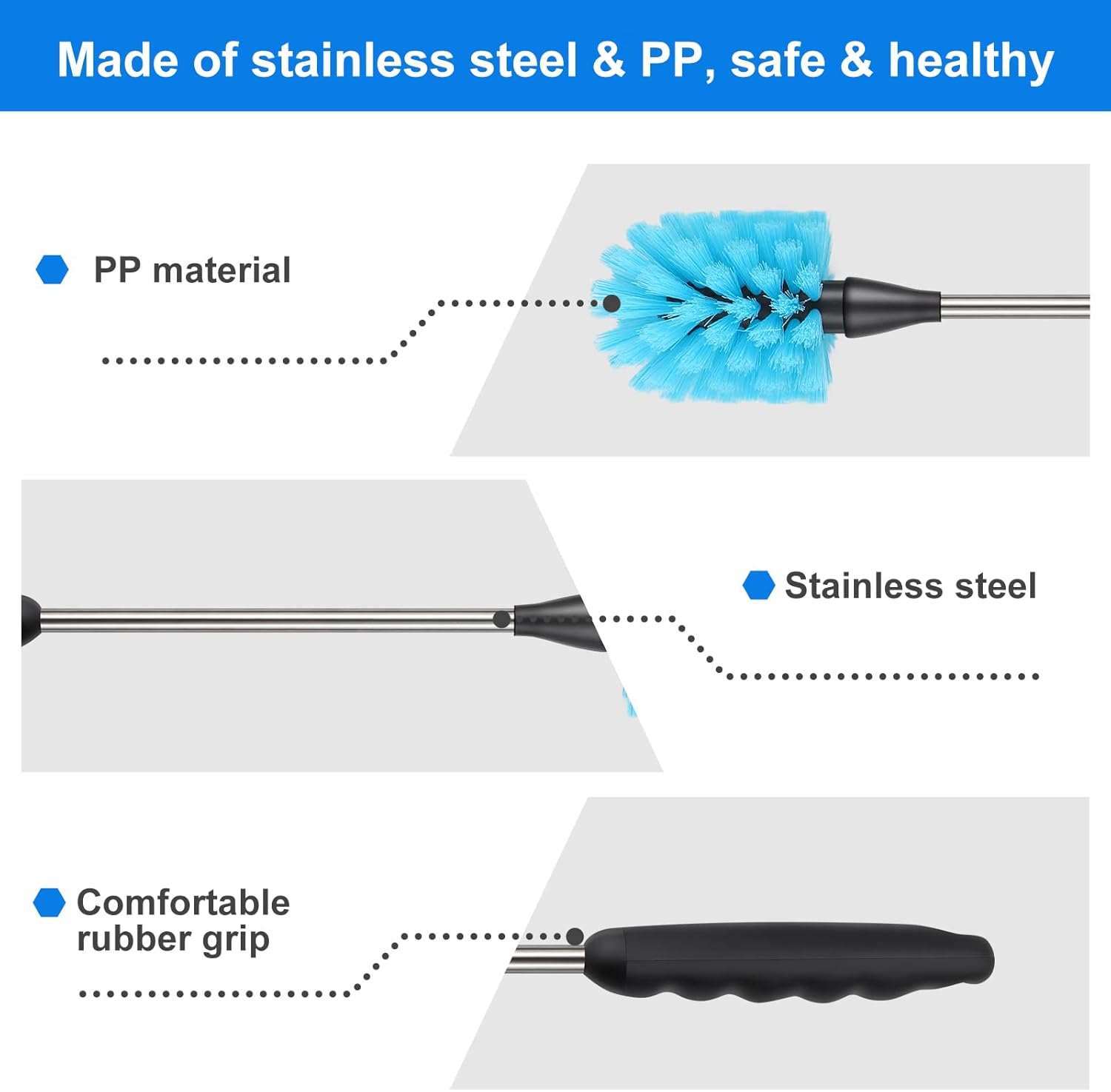 - Premium brush: Features scratch-resistant, odor-free nylon bristles and an ergonomically designed flexible stainless steel handle. The long-handled brush head easily reaches every corner of bottles, effectively removing stubborn stains from bottle bottoms and hard-to-reach areas. Blue bristles efficiently clean bottle surfaces.