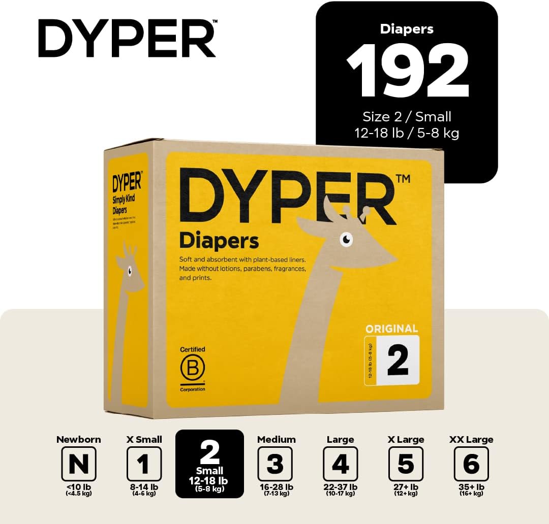 DYPER Baby Diapers Size 2 (192 Count) – Plant-Based, Hypoallergenic, Fragrance Free & Ultra Absorbent Disposable Diapers for Day and Overnight Skin Protection, Monthly Pack Size 2 Diapers