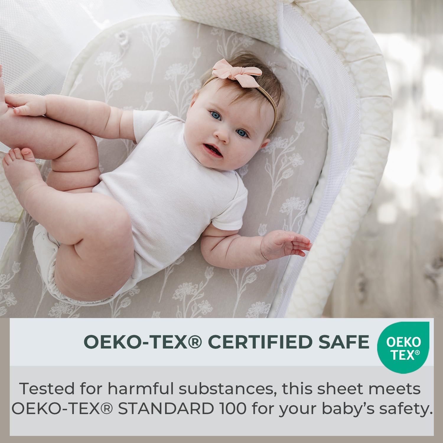 - YOUR BABY DESERVES THE BEST: This bassinet bedding is an essential addition to your baby registry and makes the perfect baby shower gift for parents you care about. For your peace of mind, our sheets are OEKO-TEX STANDARD 100 certified, ensuring they have been tested and proven free from harmful substances. Purchase with confidence knowing that if you're not satisfied with the quality of your purchase, you can rely on our satisfaction guarantee. Parenting is challenging enough; shopping for your baby should be easy, and we're here to help.