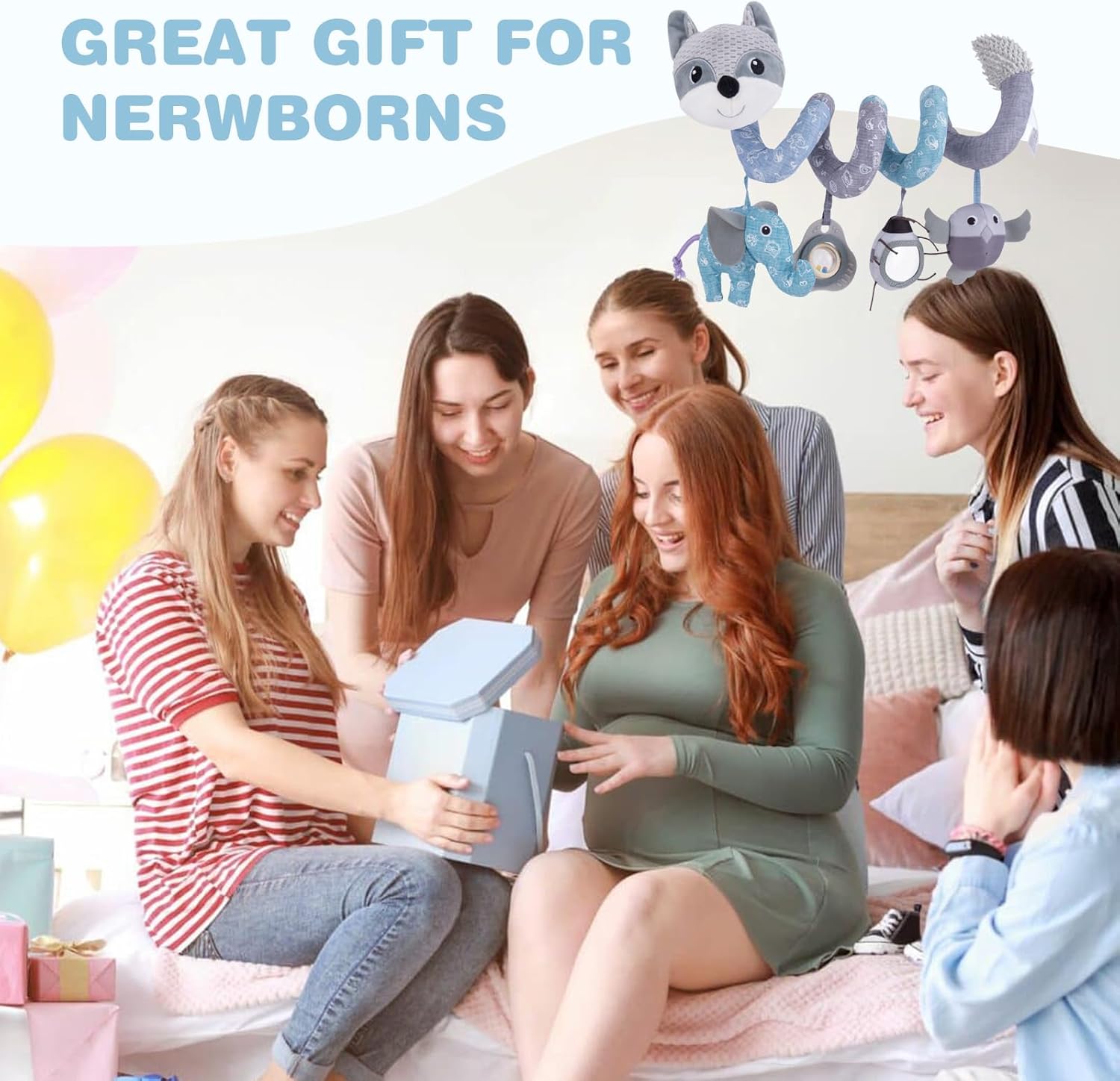 Jollybaby Crib Stroller Car Seat Toys for Baby 0-3-6-9-12 Months, Tummy Time Hanging Sensory Toys for Newborn with Music Box and Teether, Spiral Carseat Toy for Infant Boys Girls Gifts (12-Grey Fox)
