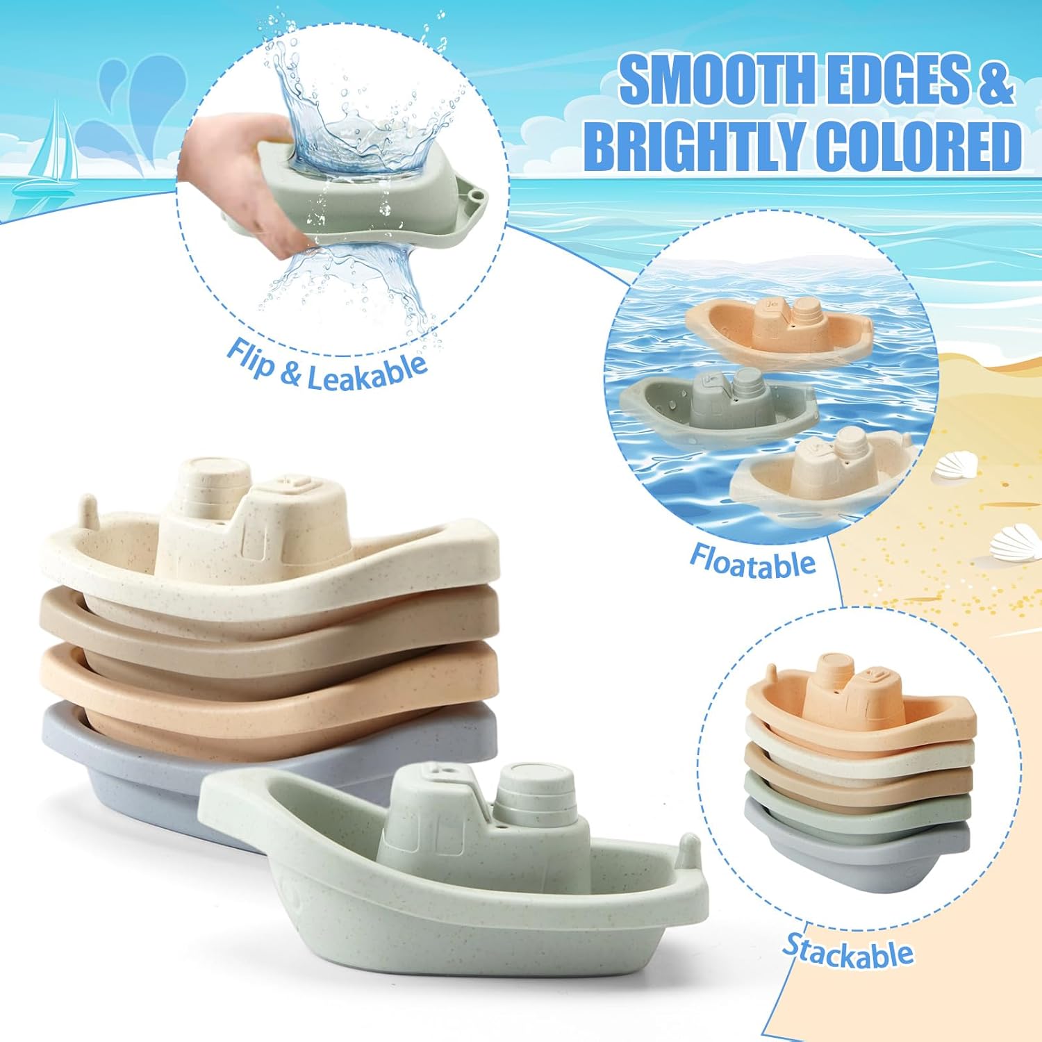- 11PCS Baby Bath Toys: Our bath toys come with 6pcs bath spoons and 5pcs floating boats, all toddler bath toys with bright colors that always attract baby's attention and promote visual development.Stacking toys also help kids learn language and fine motor skills