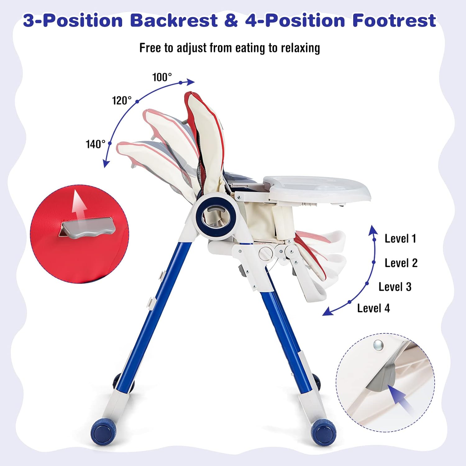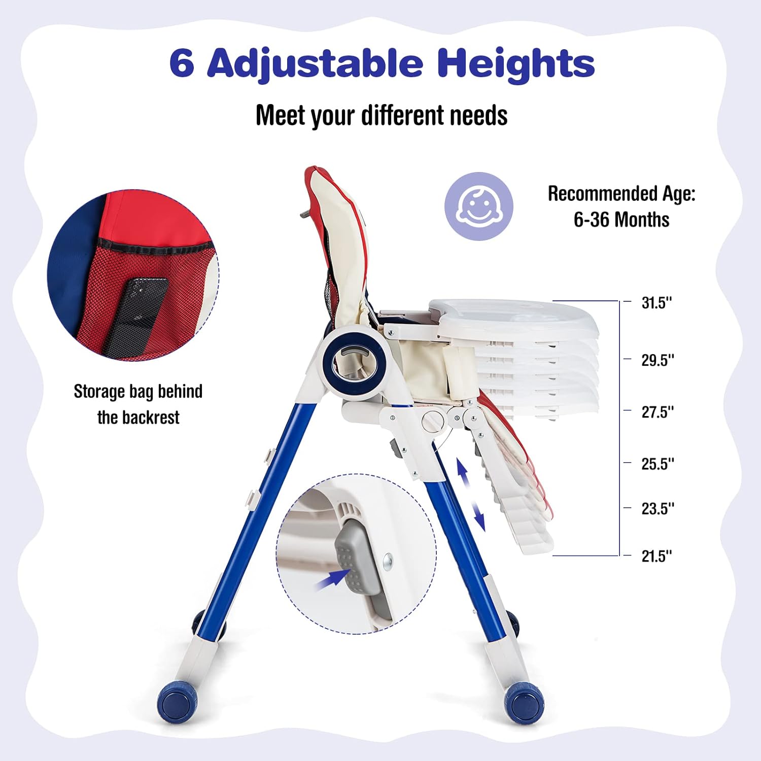 - Flexible Adjustments Meet Different Needs: Our baby high chair features 6 adjustable seat heights, 3-position backrest, 4-position footrest and 3-position food trays, allowing you to freely adjust the position according to your needs. The baby high chair can be used for feeding, playing, resting and more, accompany your baby to grow up.