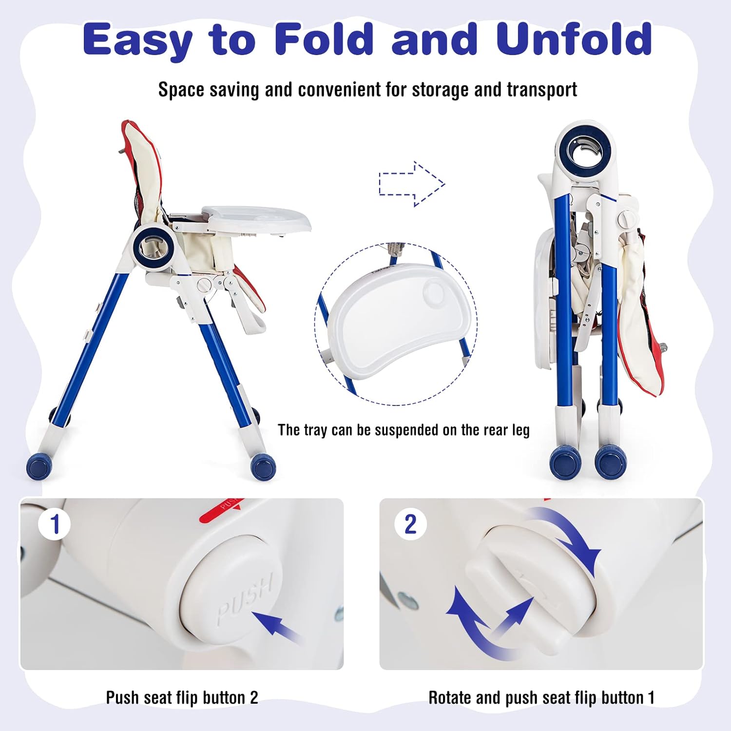 - Folding Design & Easy Mobility: The infants feeding chair is easy to fold and unfold in seconds, saving space for storage and transport. Besides, the food trays can be suspended on the rear leg, which avoids wasting time to find or store the food trays. Moreover, the portable feeding chair is built with 4 wheels and all wheel are lockable for firm standing.