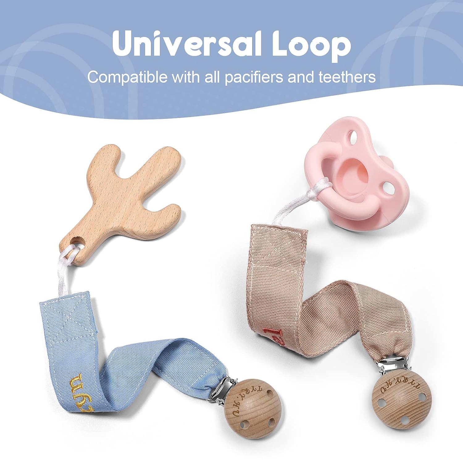 - Soft and Safety: The soother ribbon pacifier leash are made of soft webbing and the high quality material is washable; The clip head has three holes to avoid choking, making it safer for babies; Wooden stainless steel clip is lighter than silicone