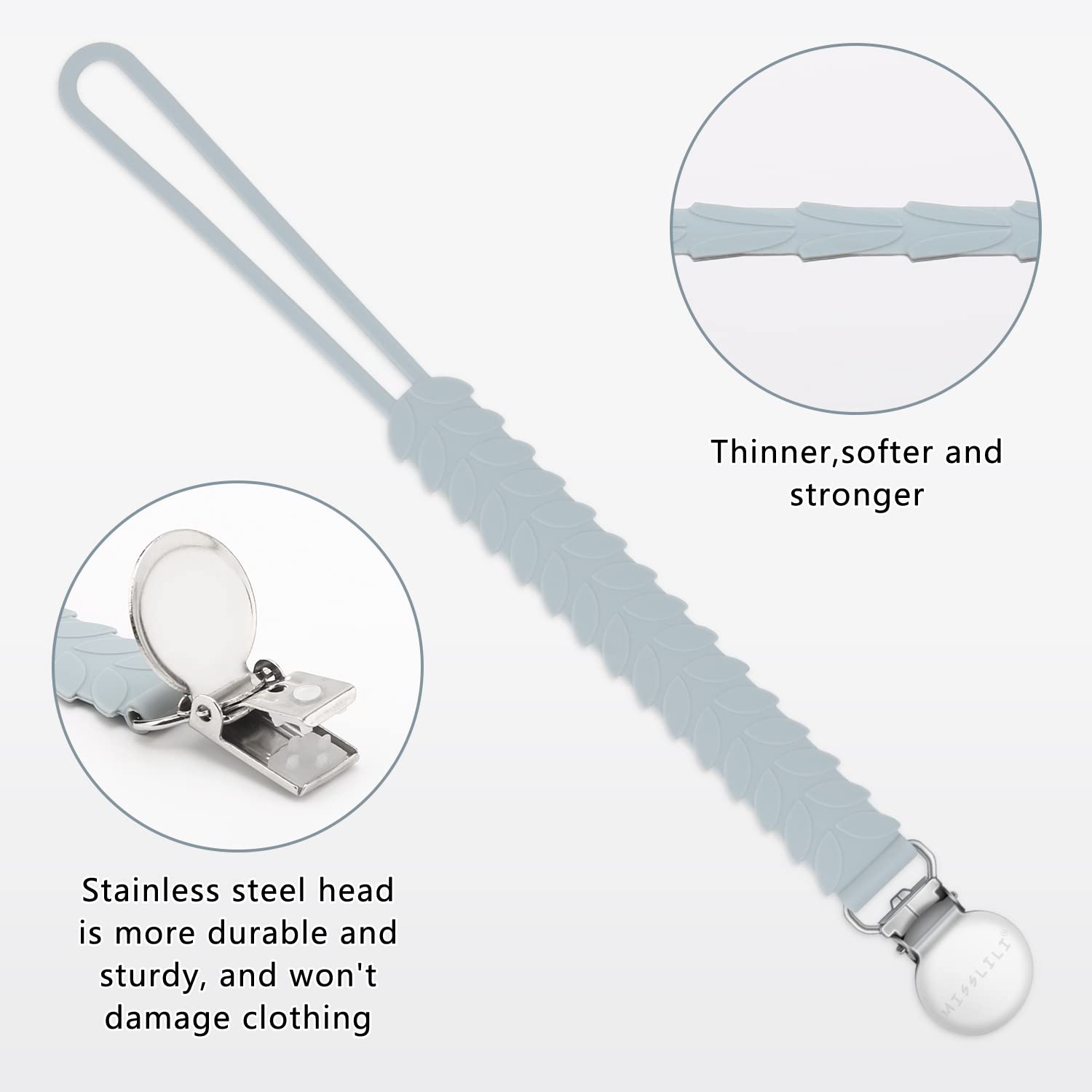 - Perfectly engineered to be gentle on clothes but strong enough to prevent your infant from pulling it off, the MISSLILI holder clasp is long-lasting stainless steel that won’t dull, tarnish, or rust over time.