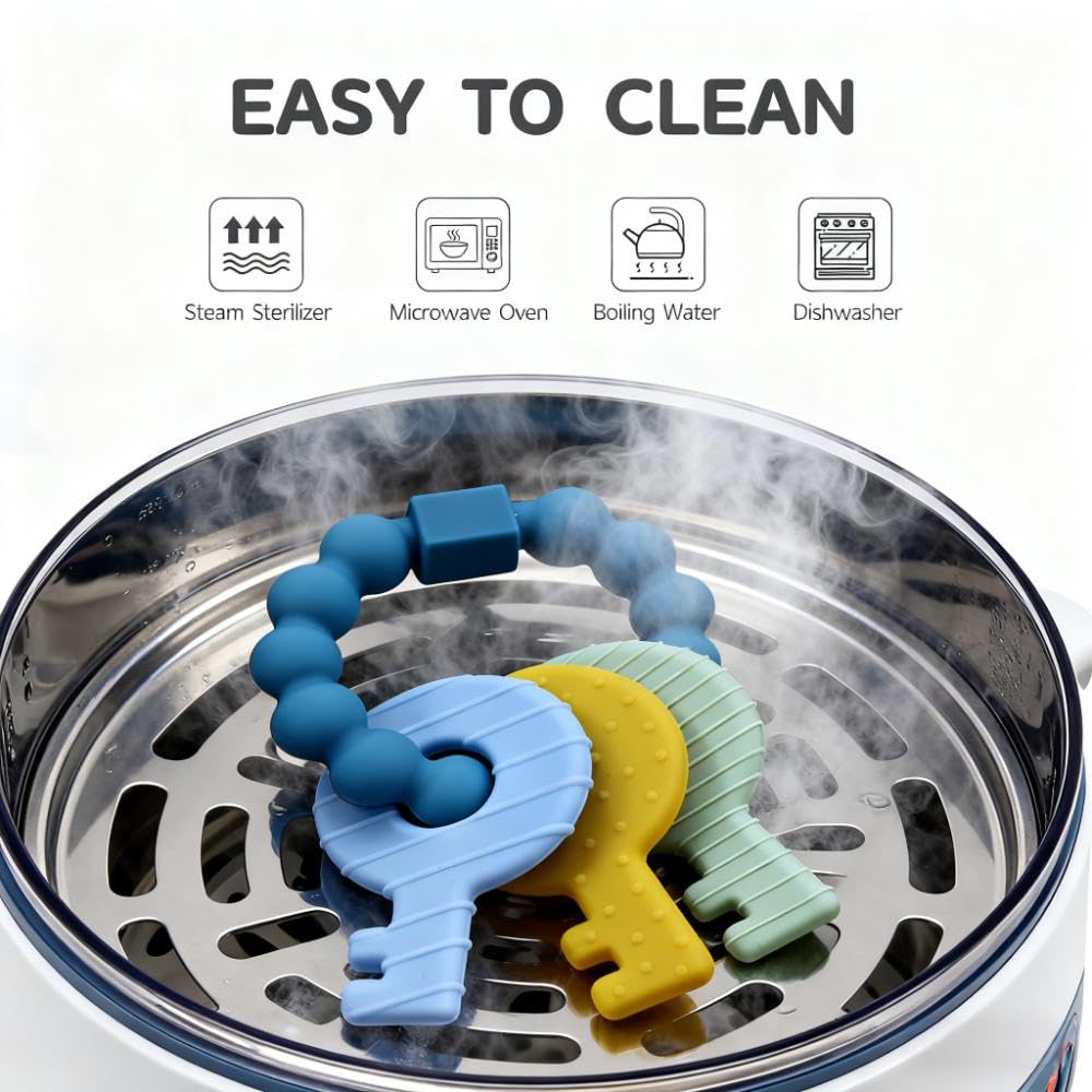- Easy to Clean: Baby keys teether can be cleaned with soapy water, dishwasher safe, or freeze a teething toy before chewing to help baby get through teething comfortably