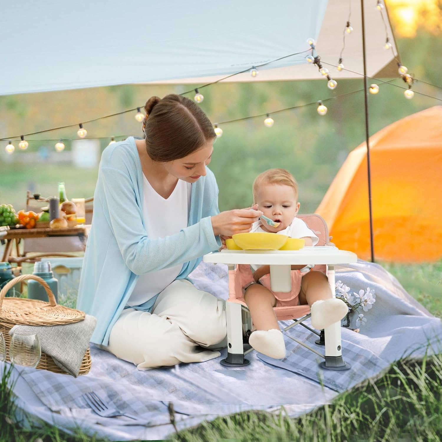 - [ Indoor/ Outdoor Use ] BabyBond Portable & Travel Booster Seat has the COMPACT & FOLDABLE design, suitable for indoor and outdoor use. With a carrying bag and a rear pocket, which is convenient to carry and store