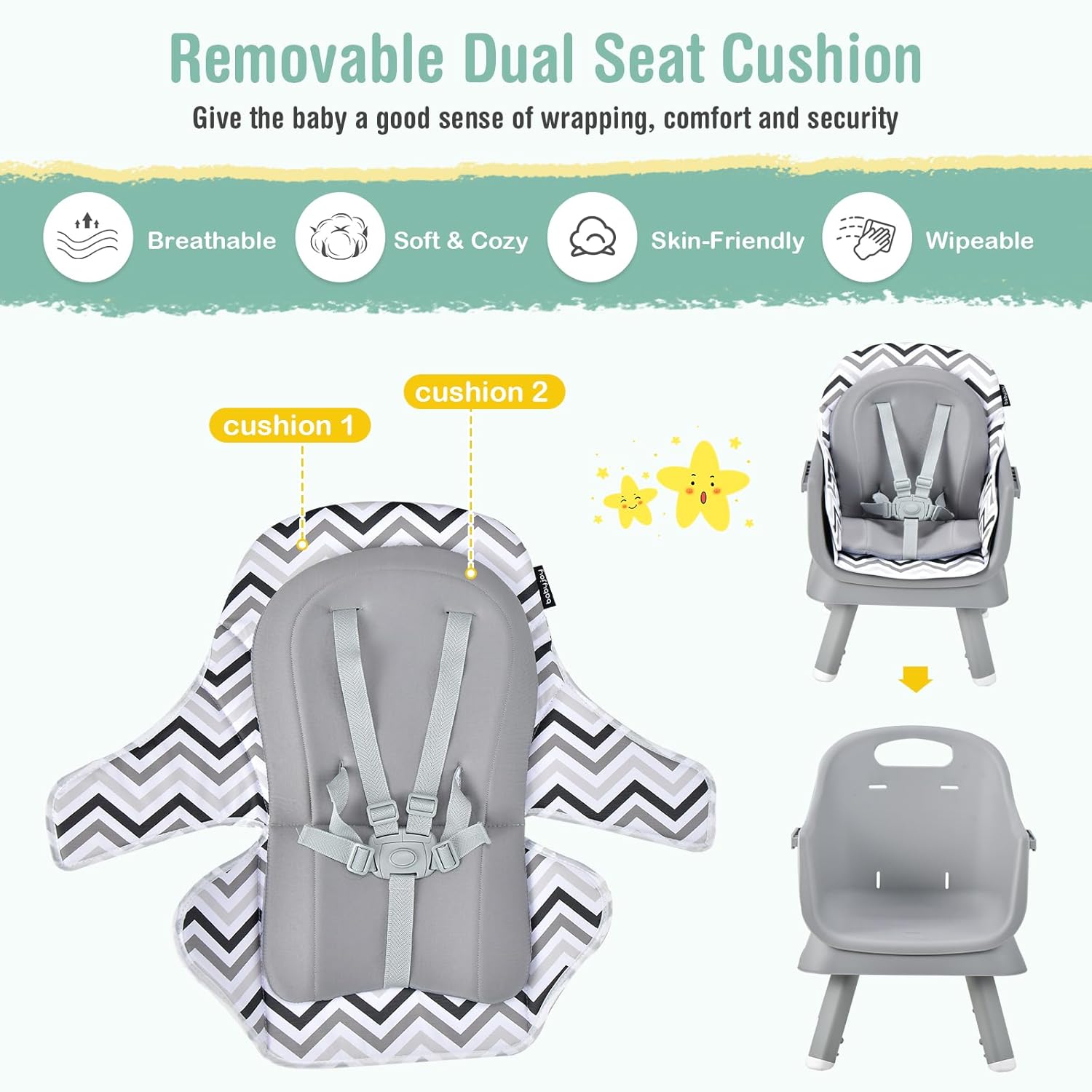 - 【Easy to Clean with Removable Tray & Cushion】 Ease of cleaning! The food tray can be fully detached and dishware safe. And double layer cushion can also be removed to wipe with a wet cloth. Parents can easily clean this feeding chair after a messy eating time and makes nursery a easy thing.