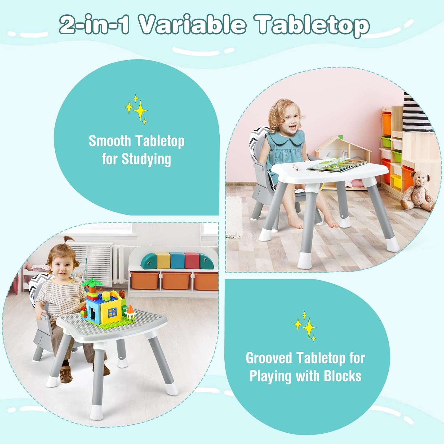 - 【Convertible Blocking Tabletop】When detaching the lower legs, this toddler high chair can be converted to table and chair set. And equipped with a blocking table cover, this multifunctional kids table offer kids a relaxing zone to write, play, eat and build block when baby grow up.