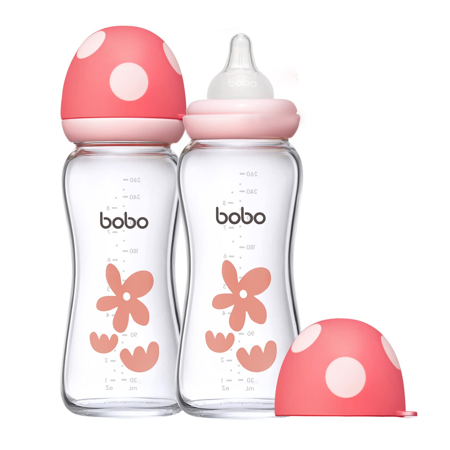 YOHKOH Natural Glass Baby Bottle with Natural Response Nipple, Newborn Anti-Colic Baby Bottles, Wide Neck Mushroom Cap Baby Bottle, Clear (8.8oz (Pack of 2), Red-A)
