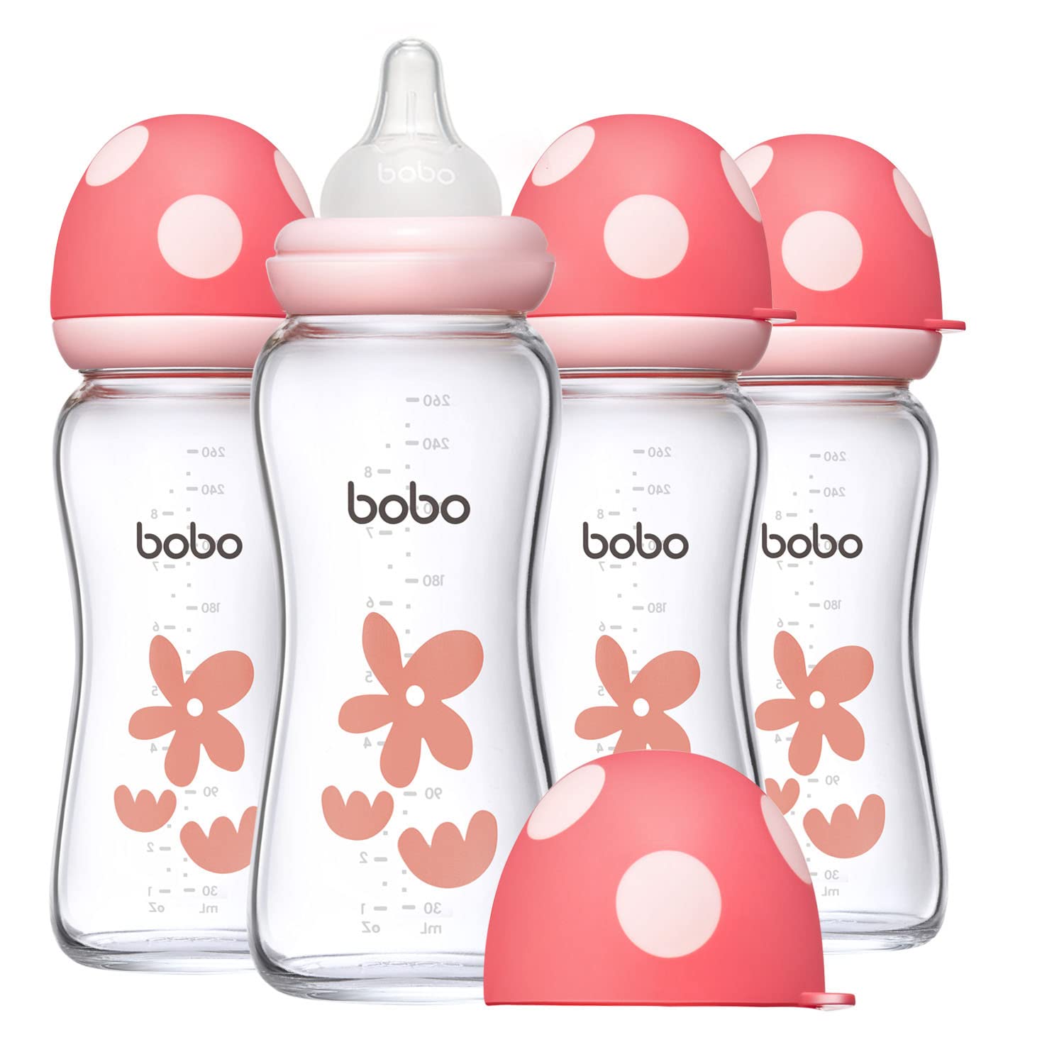 YOHKOH Natural Glass Baby Bottle with Natural Response Nipple, Newborn Anti-Colic Baby Bottles, Wide Neck Mushroom Cap Baby Bottle, Clear (Red, (8.8oz (Pack of 4))