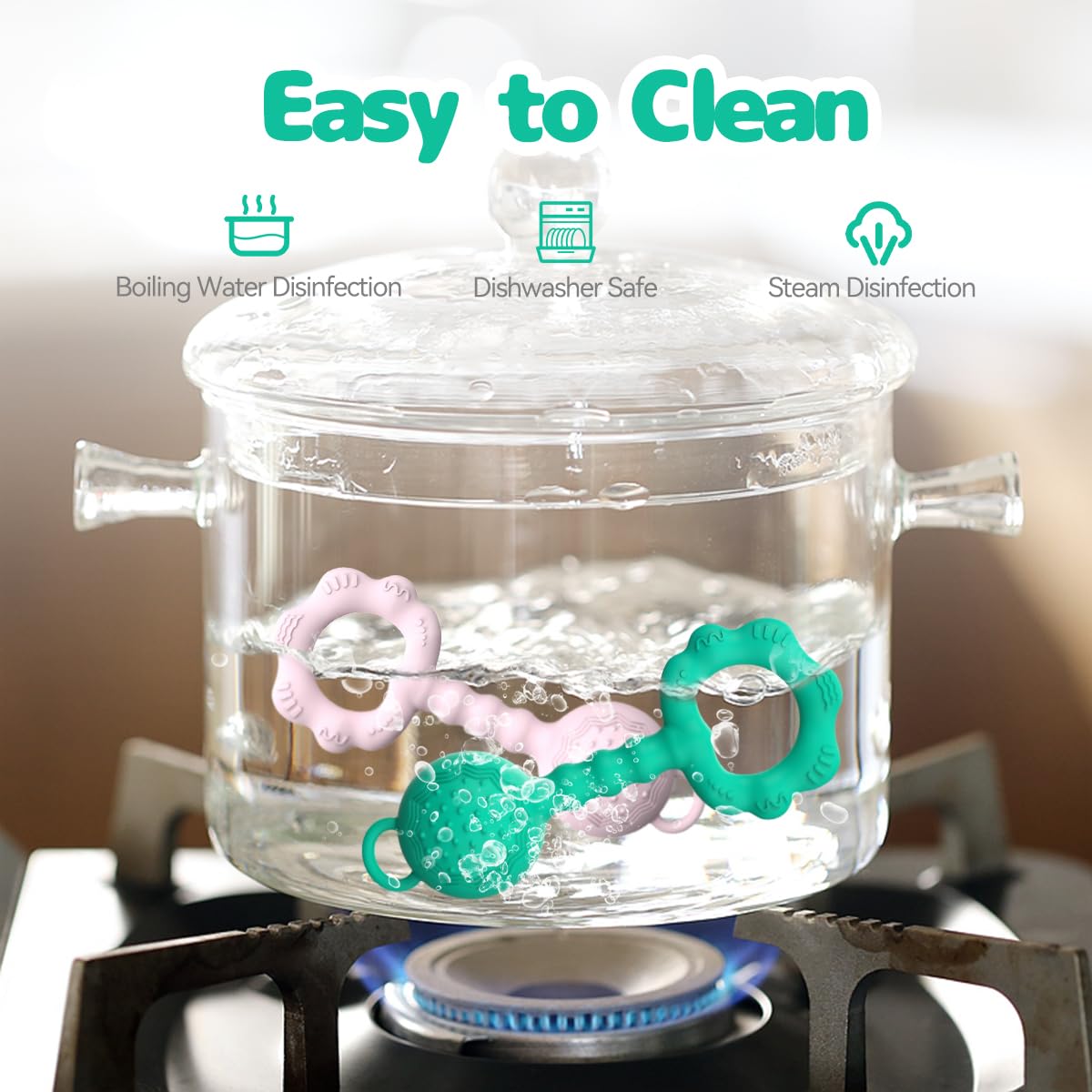 - - Easy to Clean: Use boiling water to clean and disinfect the rattle within 1 minute for first time use. Avoid boiling the teething rattle for a long time. After that, you can use water to clean it easily. If there are stains, just use soap and water to remove them.