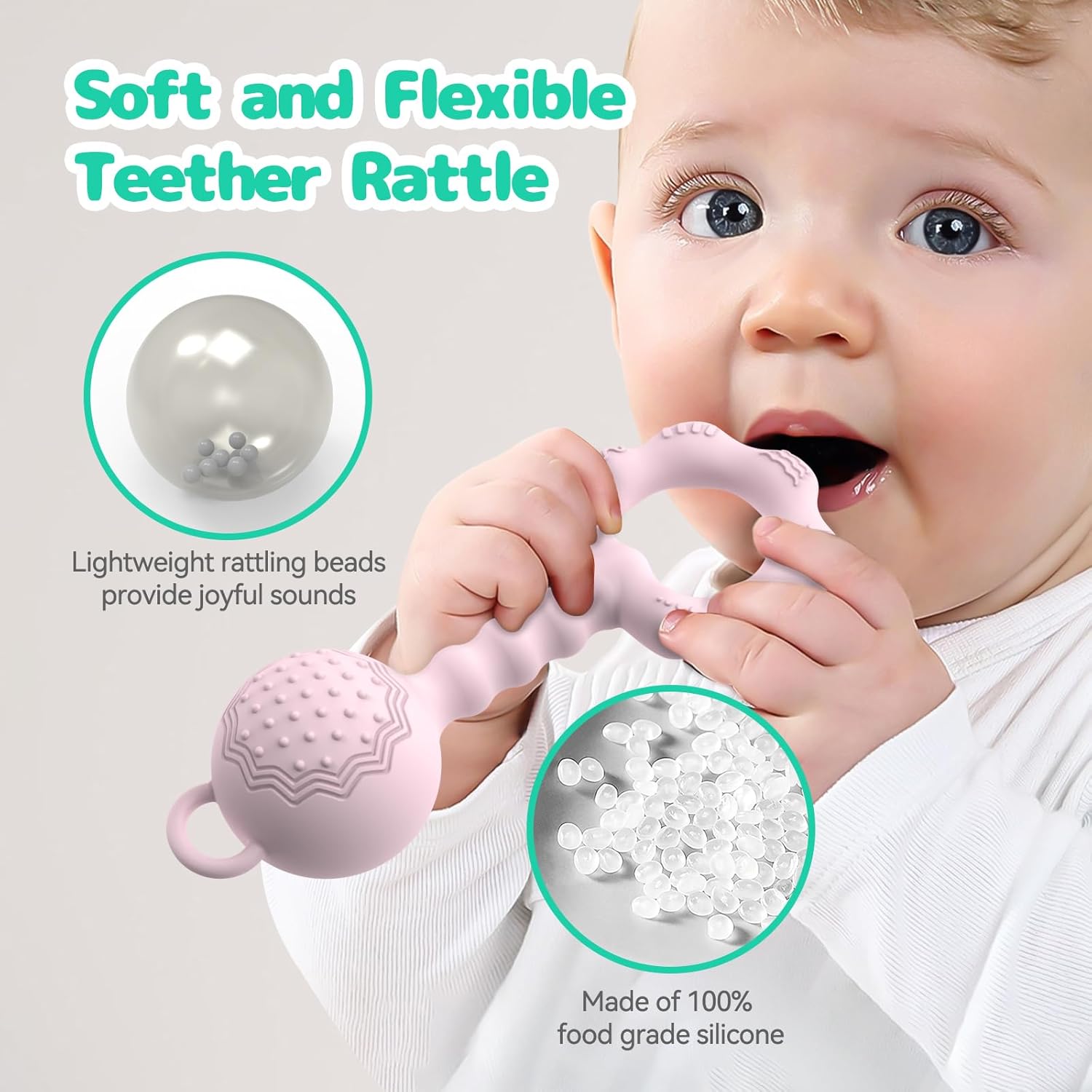 - - Safe, Durable & Comfortable: Made of food-grade silicone, our rattle teethers are toxic-free as well as BPA-free. The smooth, polished edges ensure there is no burrs, and the lightweight and easy-to-hold design makes them perfect for little hands to grasp and for baby to chew. These teethers are anti-deformed and can prevent children from choking, creating a comfortable and worry-free experience for you and your baby.