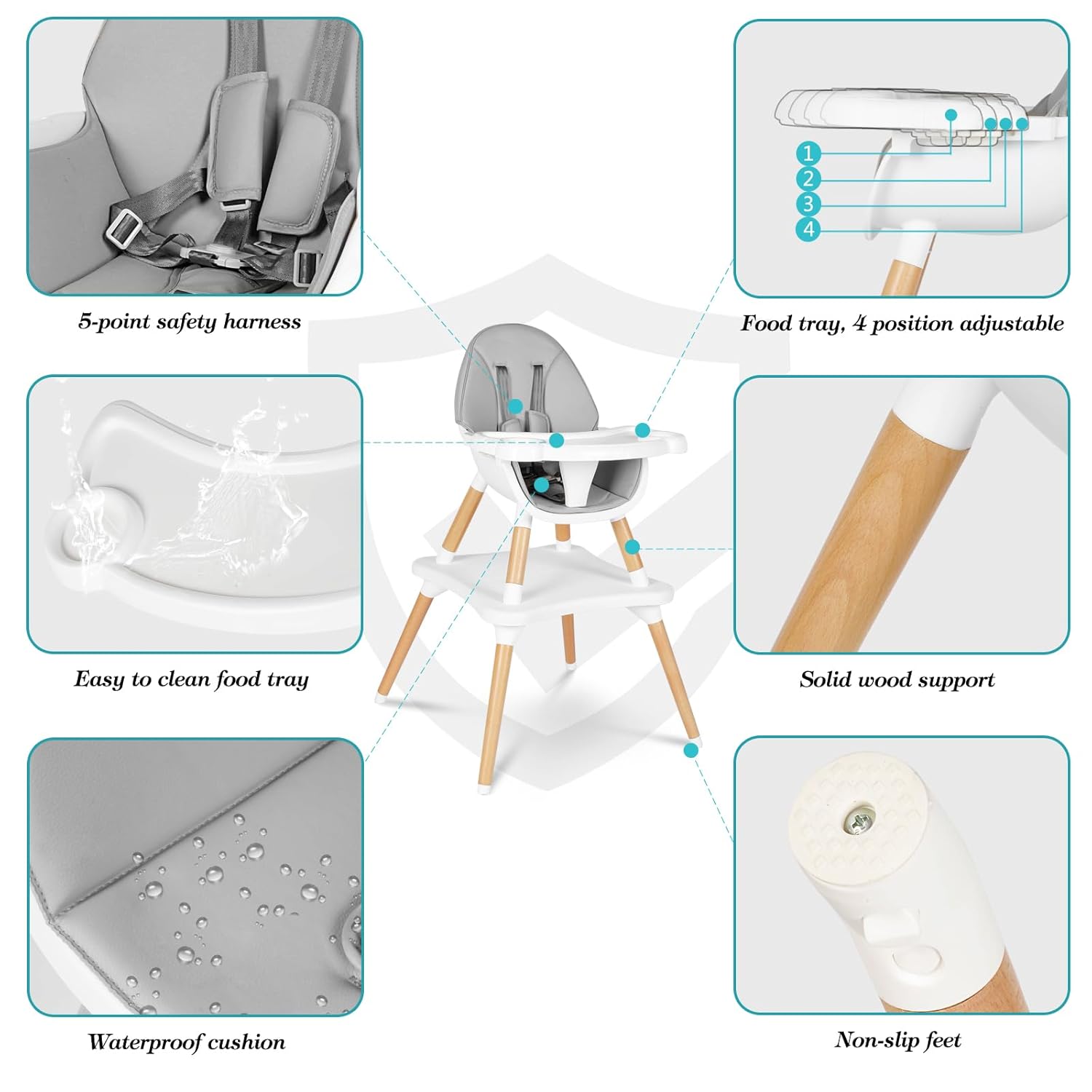 - 【Safe & Stable】This high chair combines comfort with safety. It features an adjustable five-point safety harness and a fixed safety guard to provide extra protection, preventing your baby from leaning forward or falling. The adjustable five-point safety harness adapts to infants of different heights and needs, providing them with a comfortable space. The toddler high chair stable pyramid-shaped base, paired with anti-slip pads, ensures firm stability.