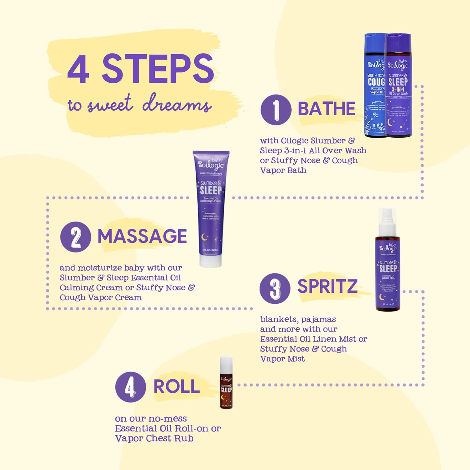 - Essential Oils for Babies: This 2-pack includes Oilogic’s best-selling Slumber & Sleep 3-in-1 All Over Wash and Stuffy Nose & Cough Essential Oil Vapor Bath. Slumber & Sleep 3-in-1 is formulated with a natural blend of Lavender and Chamomile Essential Oils to relax and cleanse baby while in the bath. Stuffy Nose & Cough uses a blend of Essential Oils to comfort baby while in the bath and support better breathing.