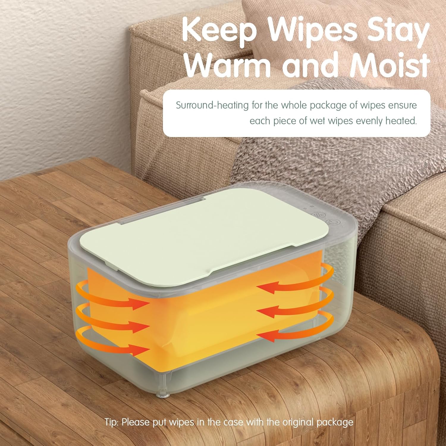 - Advanced Surround Heating Method: Our baby wipe warmer is different from the common brand wet wipes dispenser, we abandon Lagging bottom heating. Heating around the inner of the box, ensuring that each piece of wet wipes can be evenly heated, avoid appearing local overheating