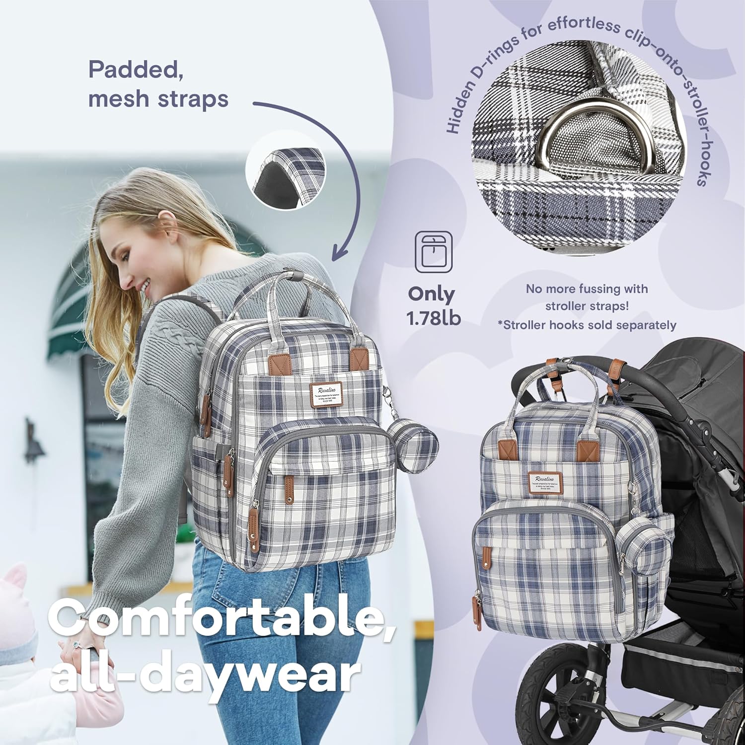 RUVALINO Diaper Bag Backpack, Multifunction Travel Pack Maternity Baby Changing Bags, Large Capacity, Waterproof, Blue Plaid