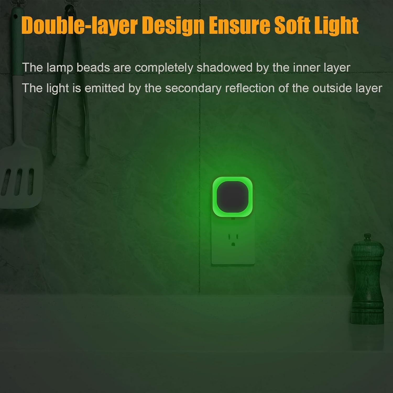 - 【Double Layer Design, Soft Light】: Firstly, our lamp beads are completely shadowed by the inner layer that is made of high-quality anti-glare material, Secondly, the light is emitted by the reflection of the outside layer edge, not by the lamp beads directly like many other night light. So the light is soft, not dazzling, not too harsh to your eyes no matter when sleeping or walking around at night. Especially suitable for children, the elderly and other people who are sensitive to light.