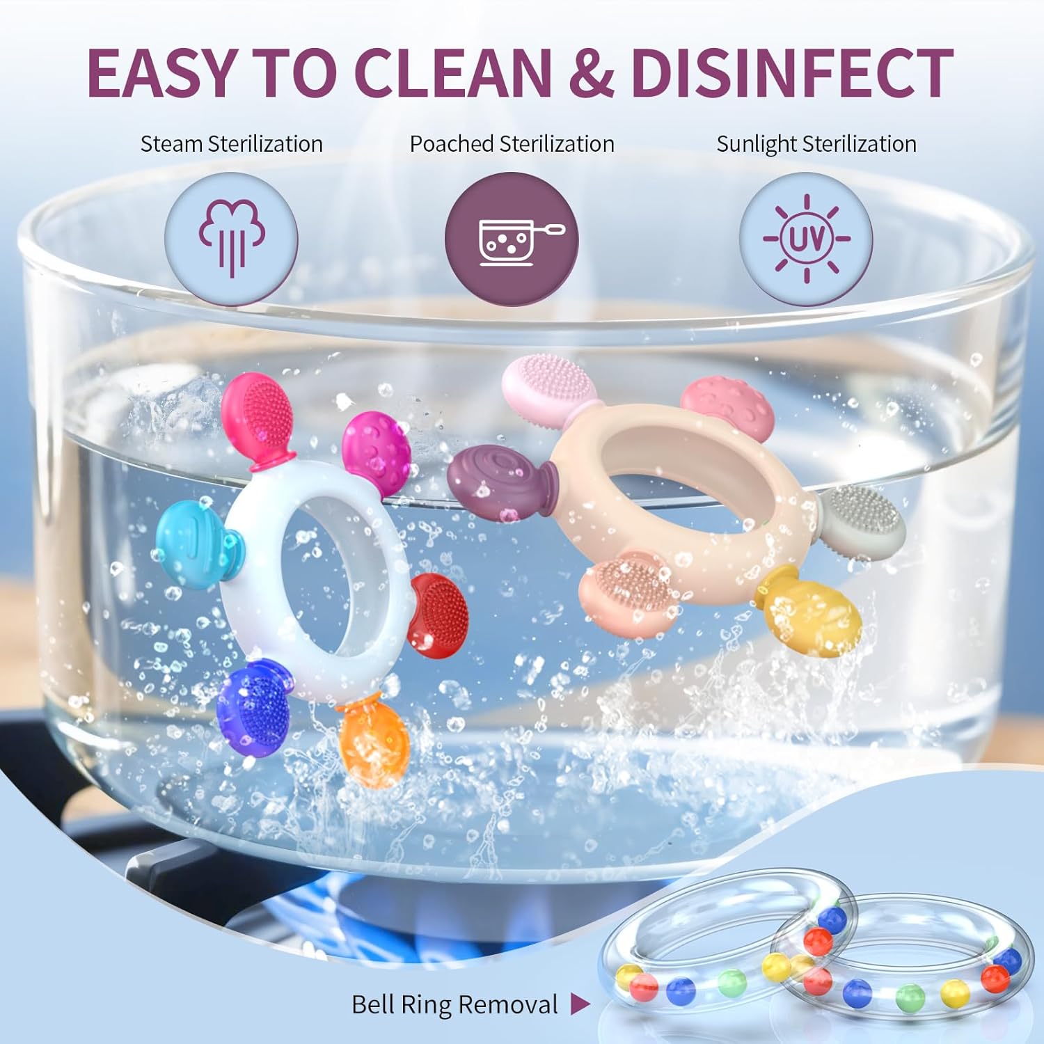 - EASY TO CLEAN: Our teething toys are easy to clean, simply wash with mild soapy water or boil to sterilize. Teething toys can also be stored in the fridge for extra cooling.(Note: the wooden ring can't be boiled, please remove it)