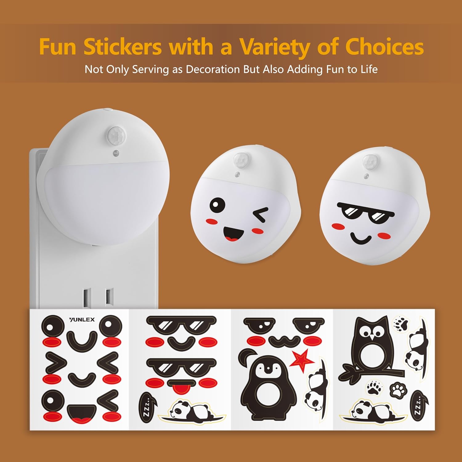- Decorative and Compact: Stickers are included to make this night light unique wall decor when it's not working during the day. The compact and small design allows it to take up only a single receptacle, leaving the second outlet free for use when plugged into a standard outlet.