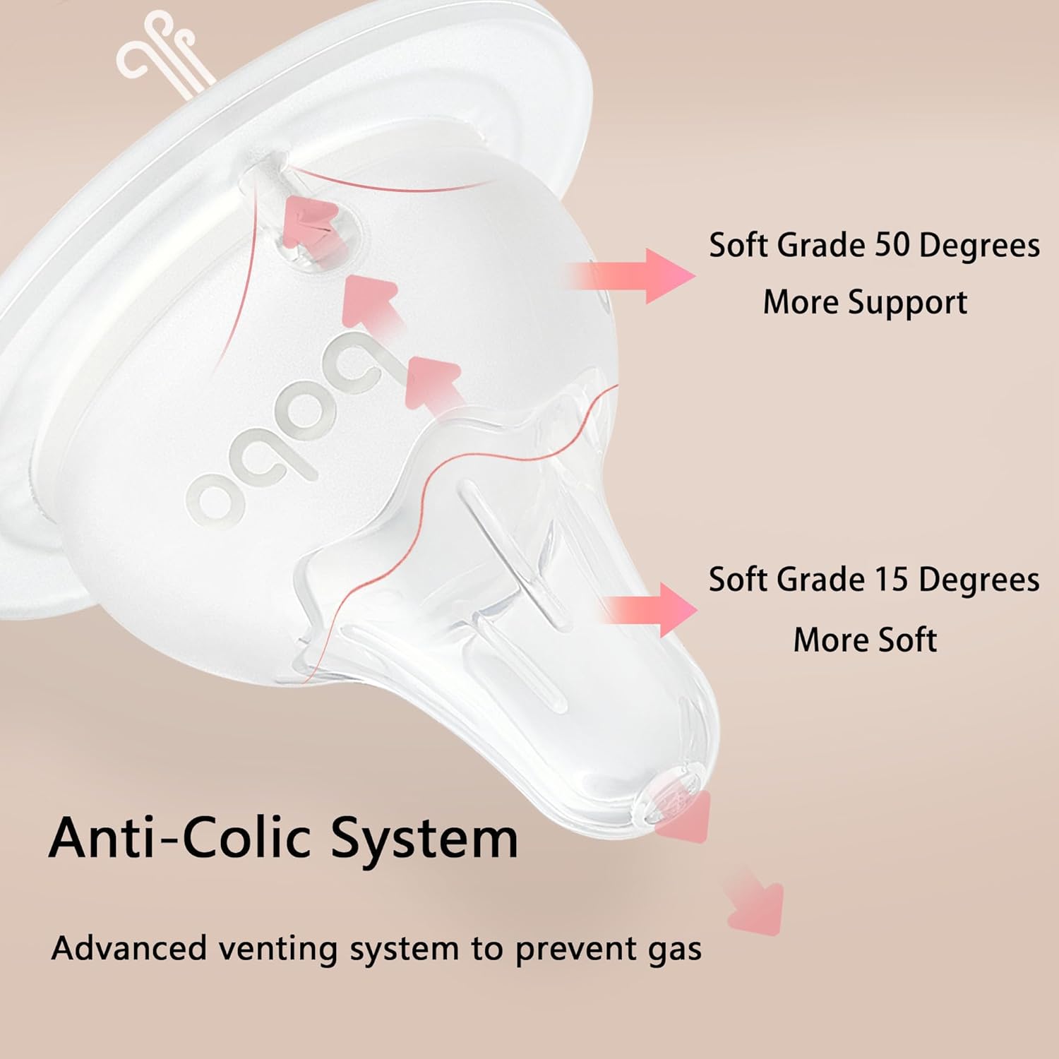 - Anti-Colic System: The bottom of the nipples has intelligent pressure regulating valve, balance internal and external pressure, milk and air separation, to avoid the baby breathing too much air caused by colic flatulence.
