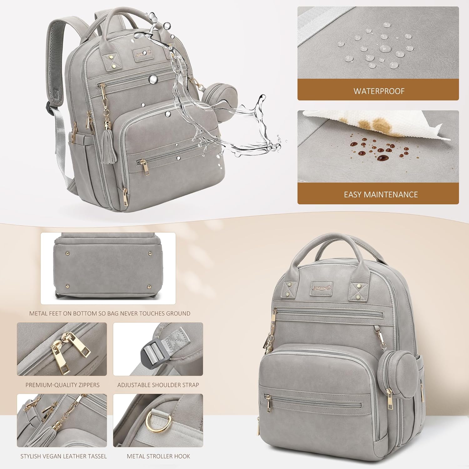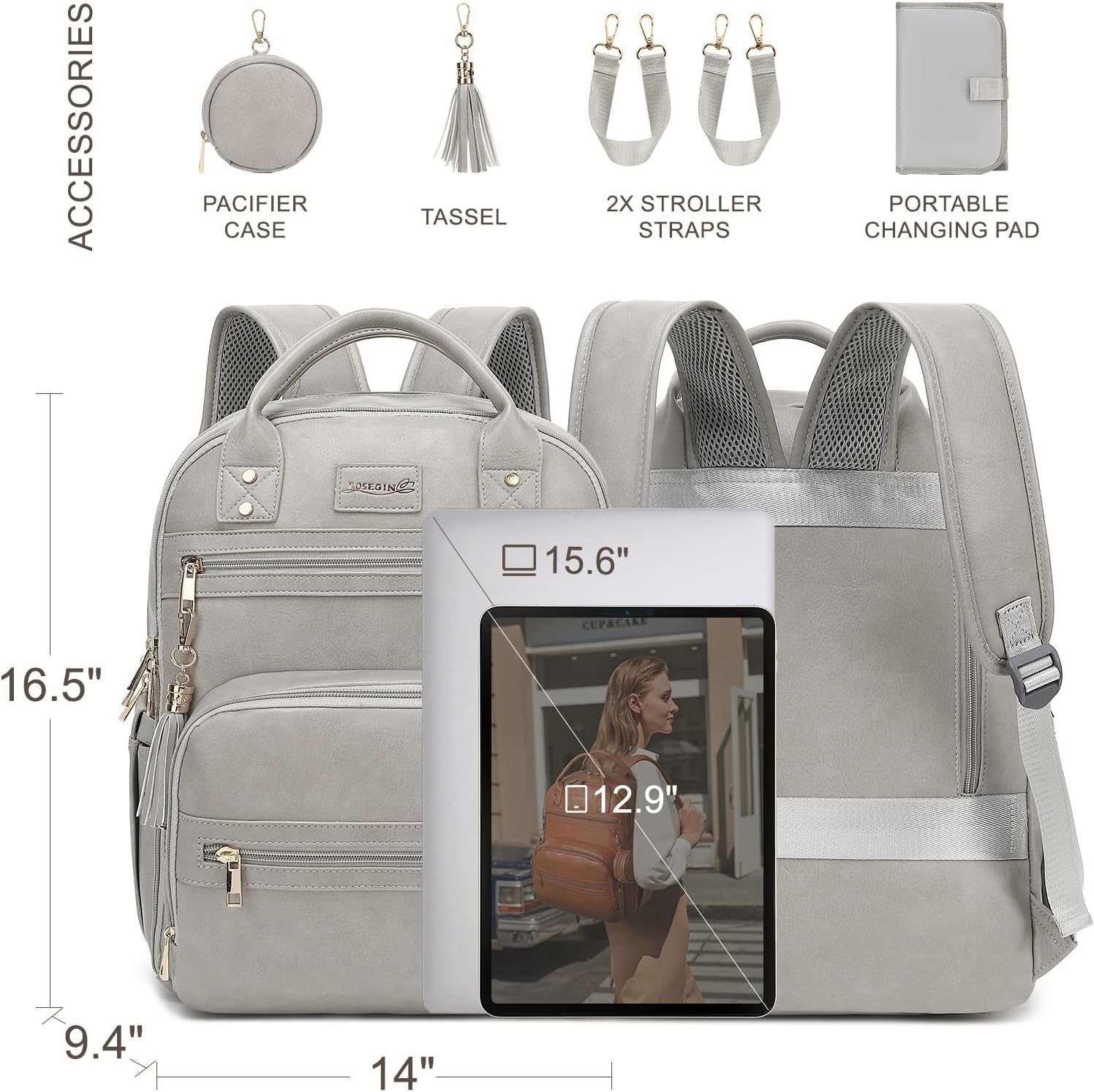 Premium Vegan Leather Diaper Bag Backpack with Waterproof Changing Pad, Reinforced Zippers & Odor-Free, 20 Pockets Pro Organizer, Fits 15.6" Laptop, Stroller Straps, Baby Bag for Mom, Grey